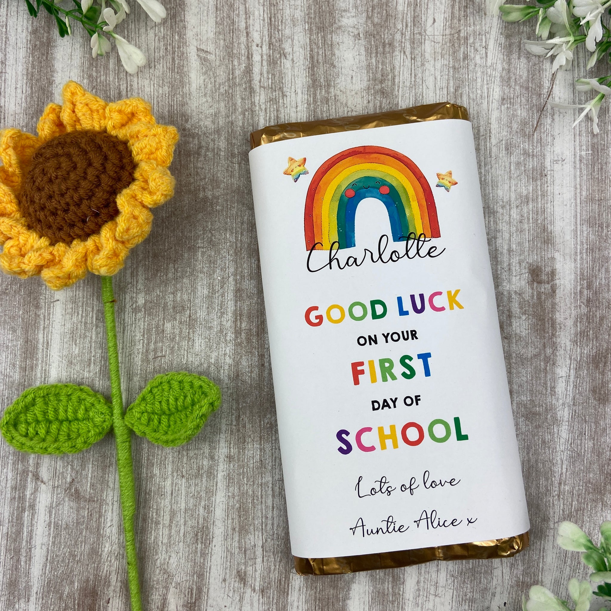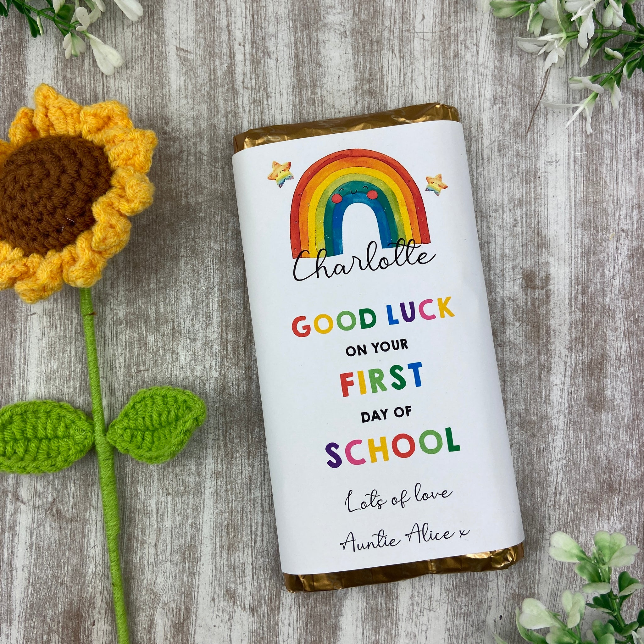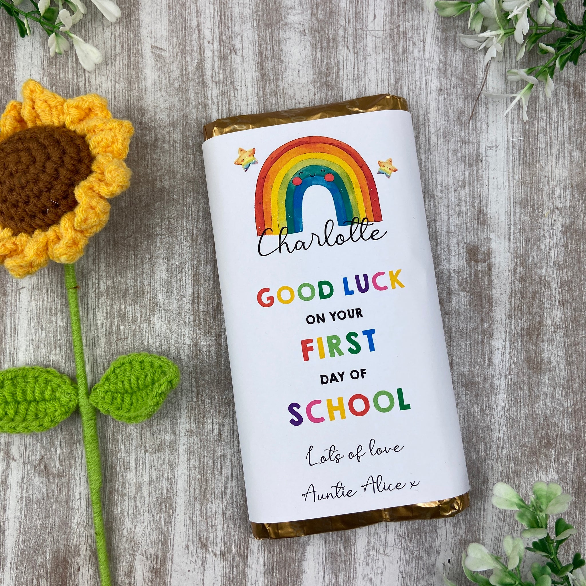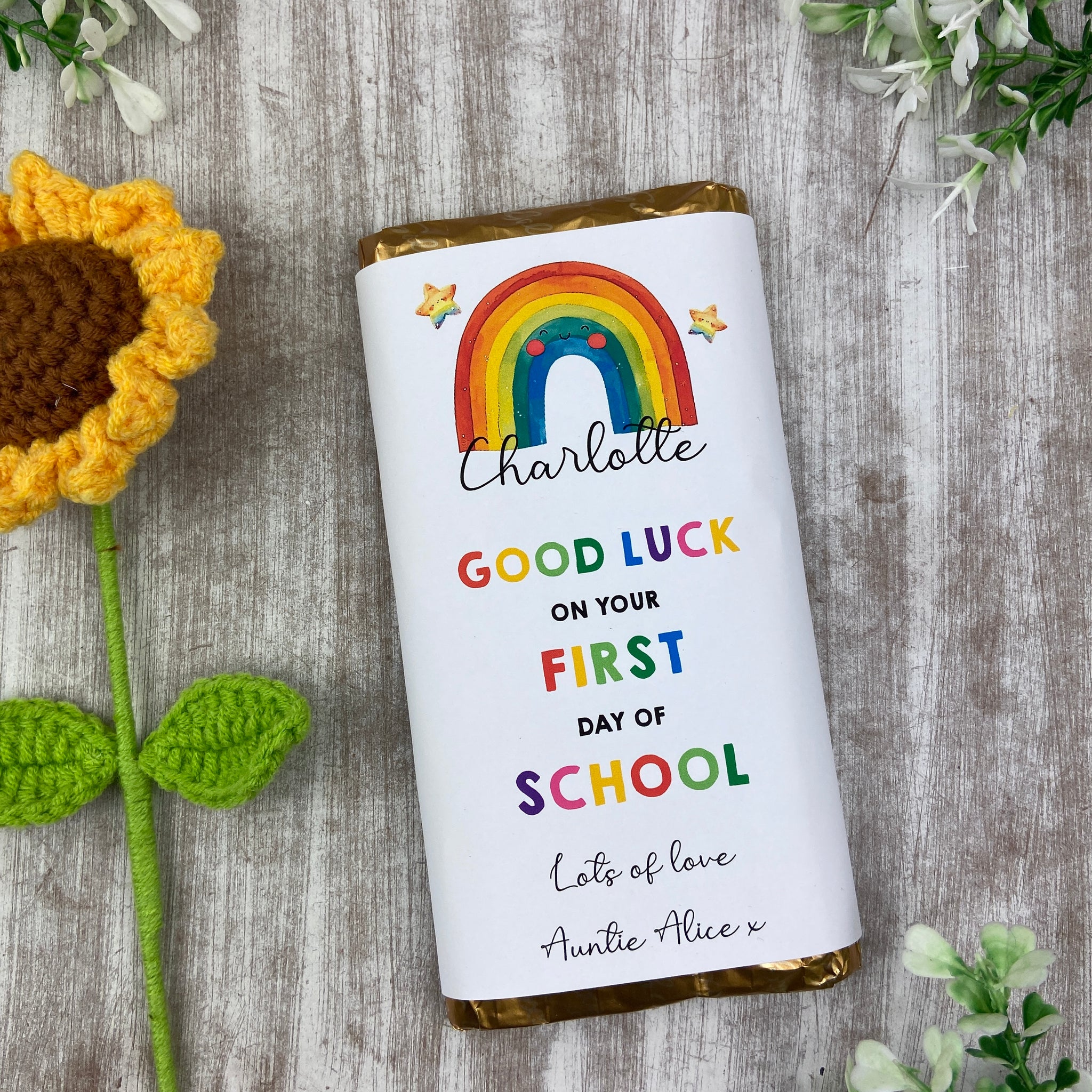 Our Personalised Back to School Chocolate Bar is the perfect good luck gift for their first day at School. Wrapped in a charming design featuring a smiling rainbow and stars, itās sure to make them feel special and confident.