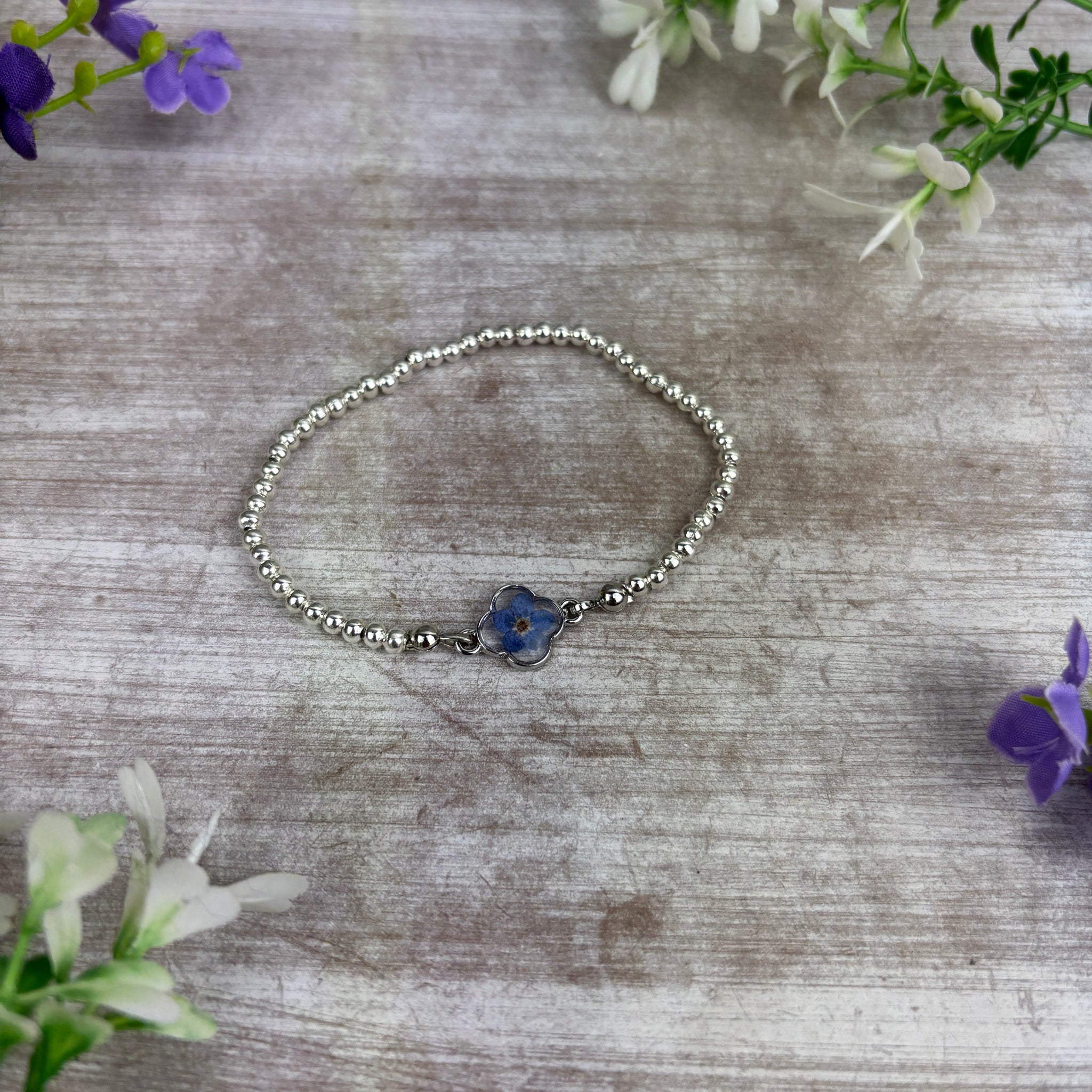 Featuring a dainty blue forget-me-not flower charm set on a polished silver plated beaded stretch bracelet, this piece is a subtle yet powerful symbol of love, remembrance and connection. A thoughtful gift for someone grieving, remembering a loved one, or simply needing a little comfort.