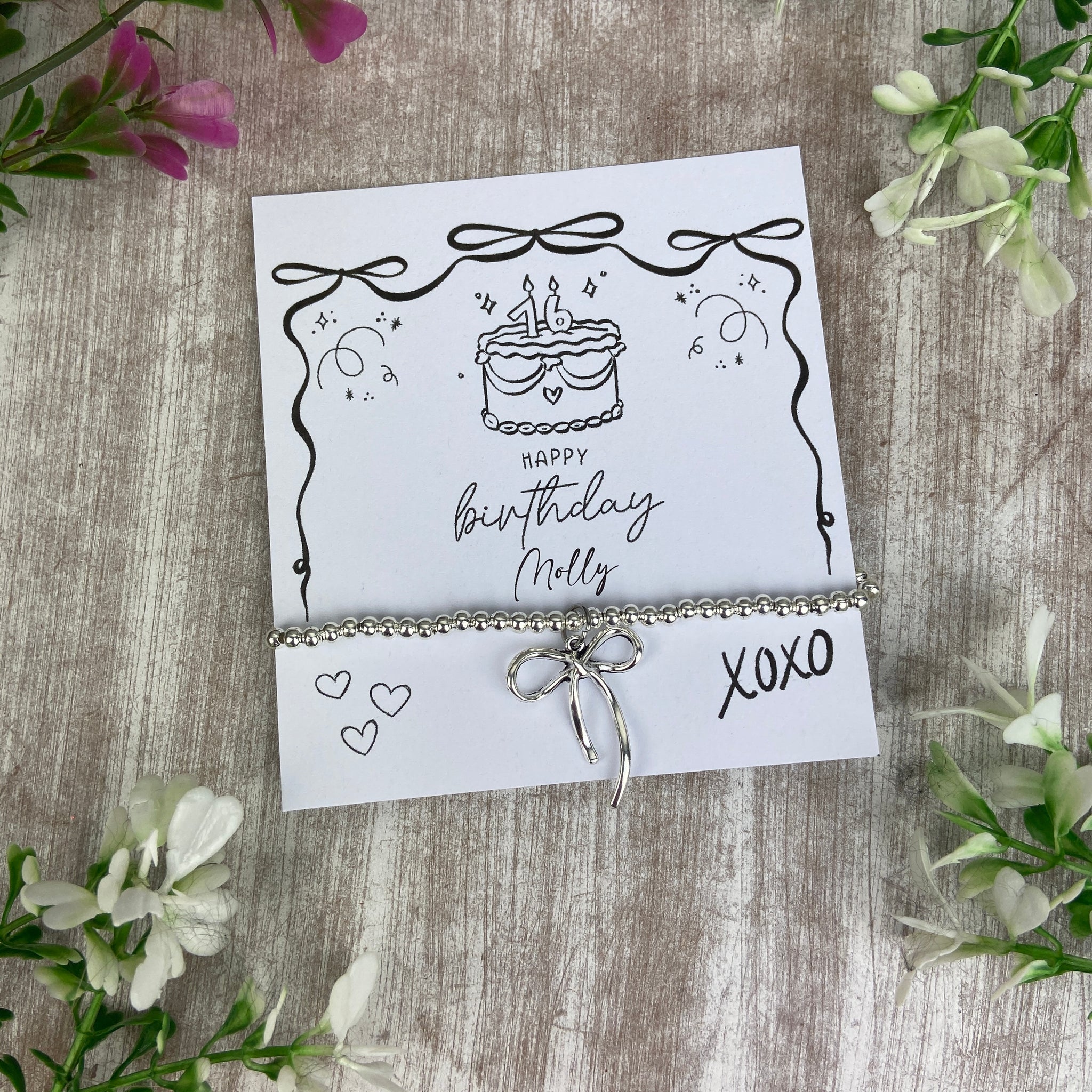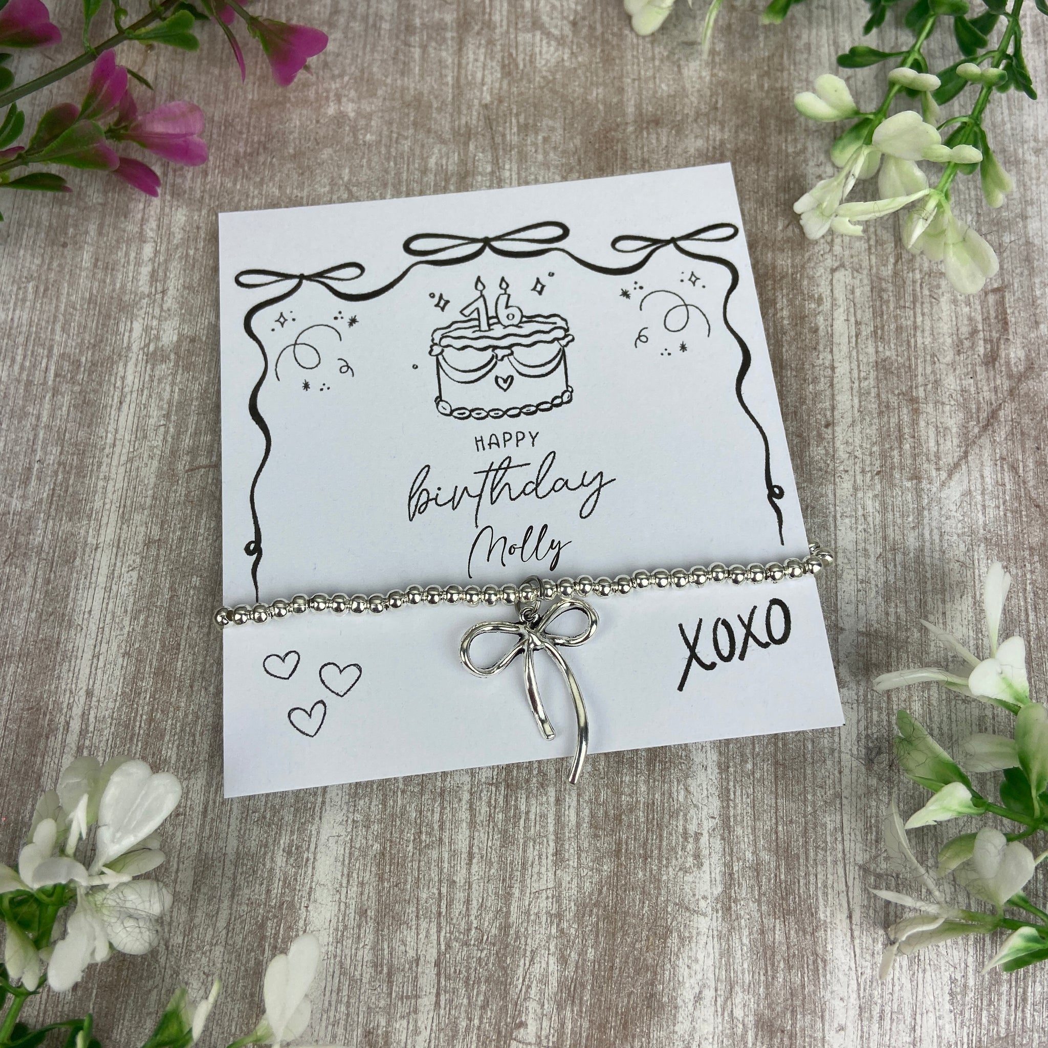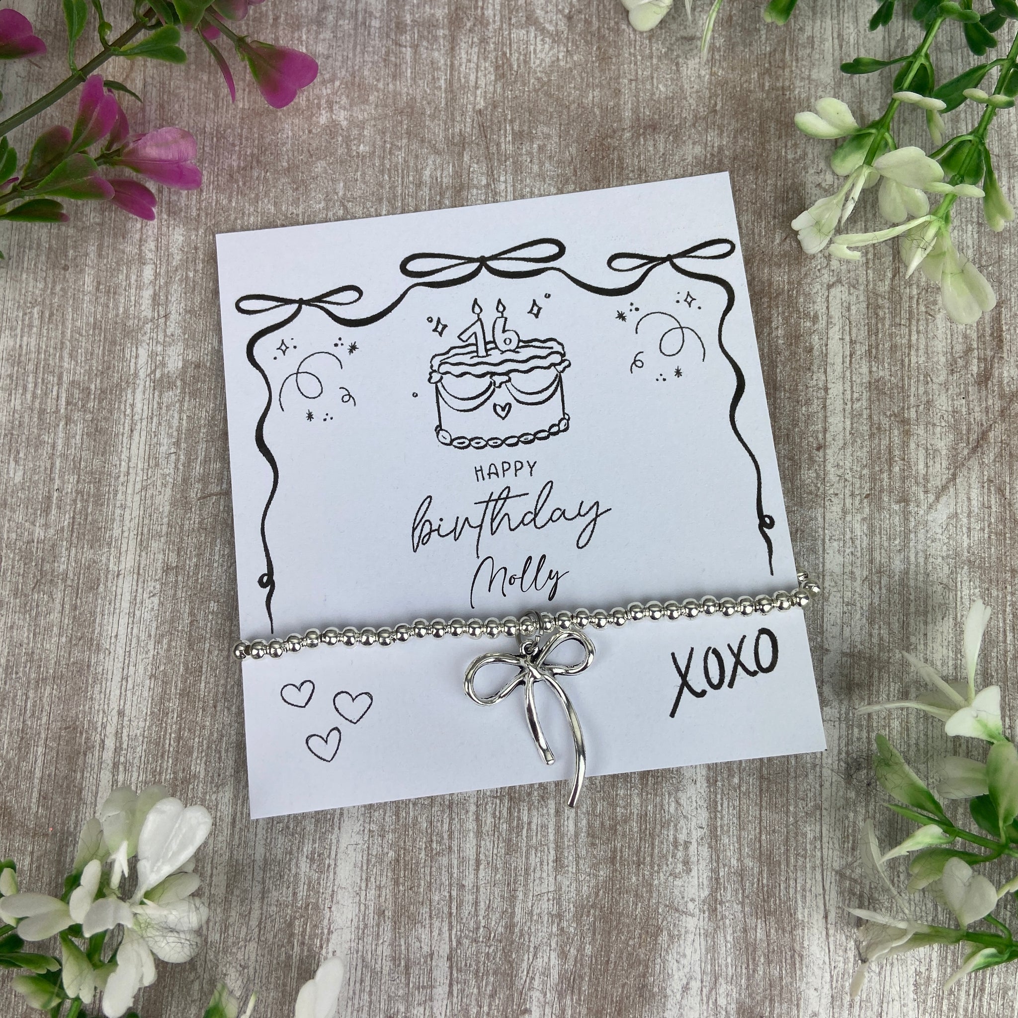🎂 Make their sweet 16th sparkle with our Whimsical Bow Birthday Bracelet – a beautiful beaded bracelet with a delicate silver bow charm that’s as joyful and elegant as a perfectly wrapped present.