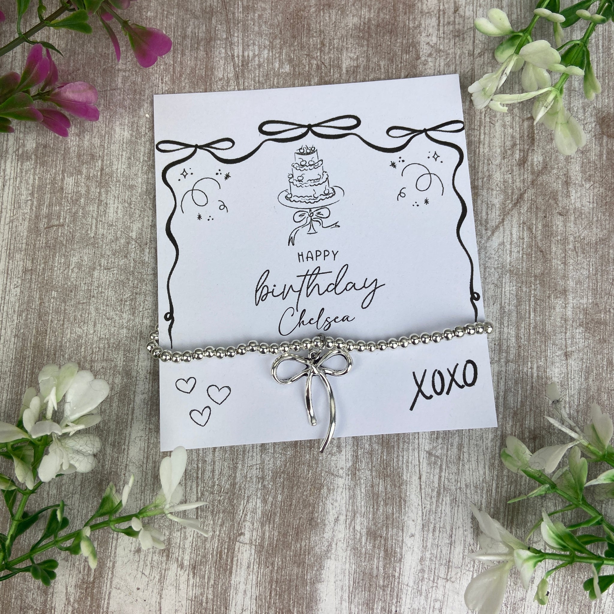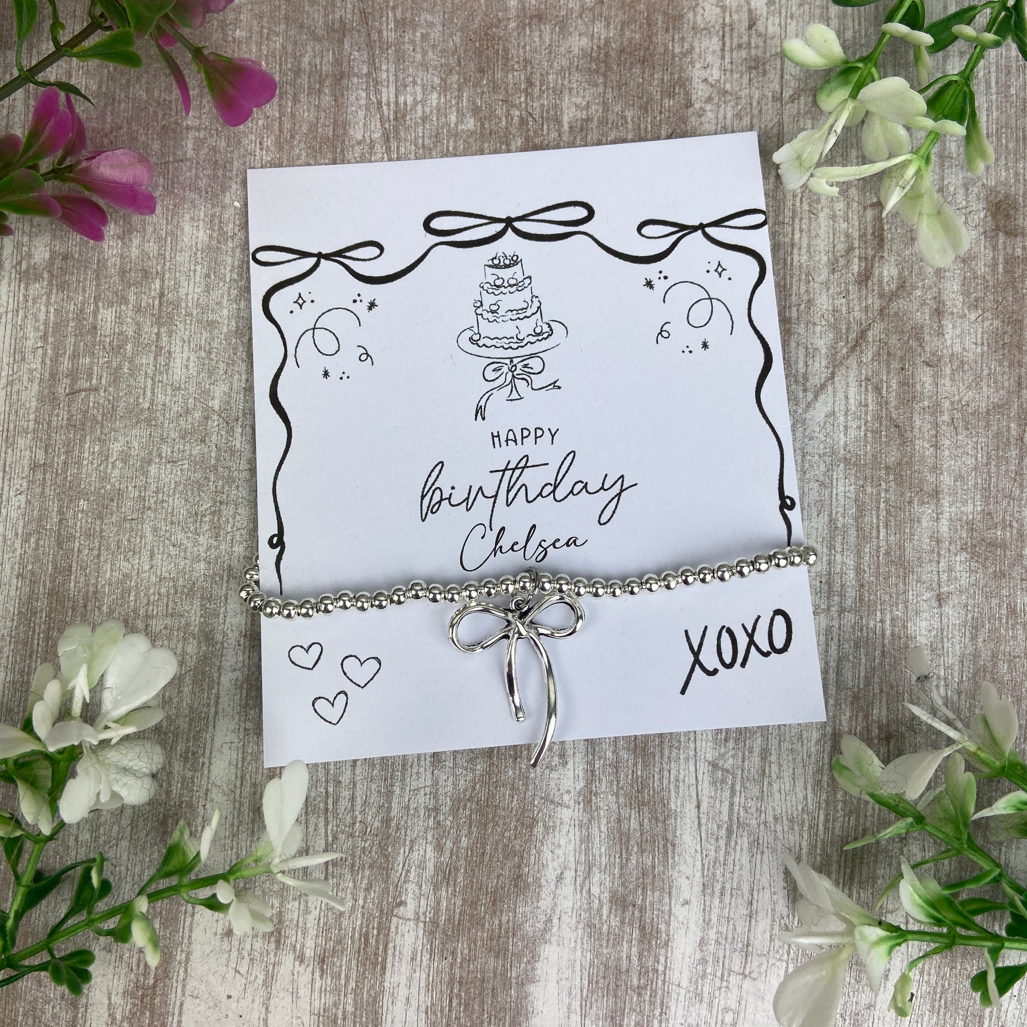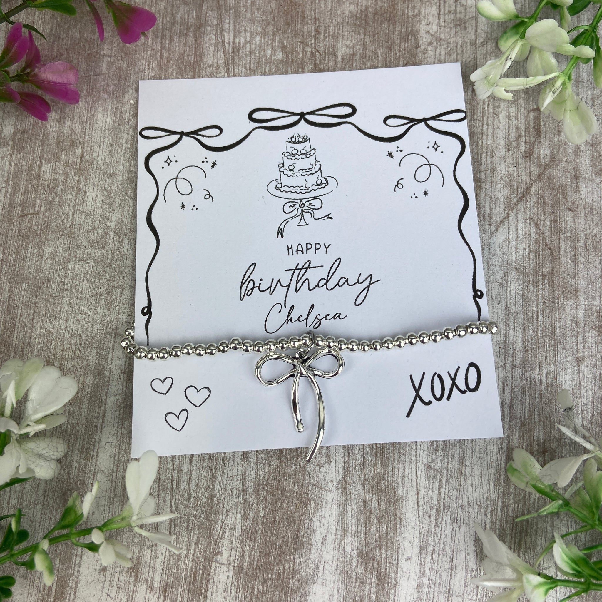 🎂 Make their special day sparkle with our Whimsical Bow Birthday Bracelet – a beautiful beaded bracelet with a delicate silver bow charm that’s as joyful and elegant as a perfectly wrapped present.