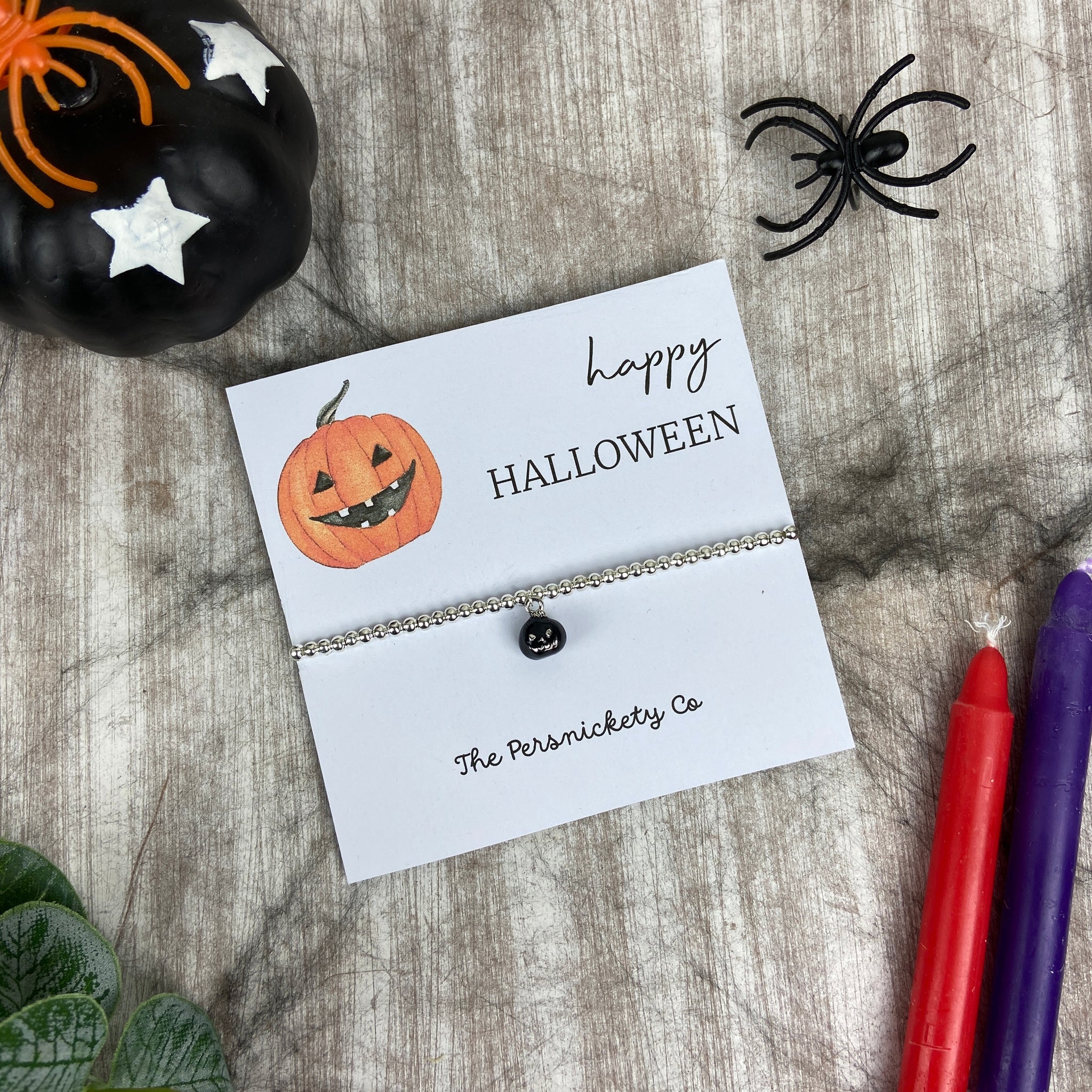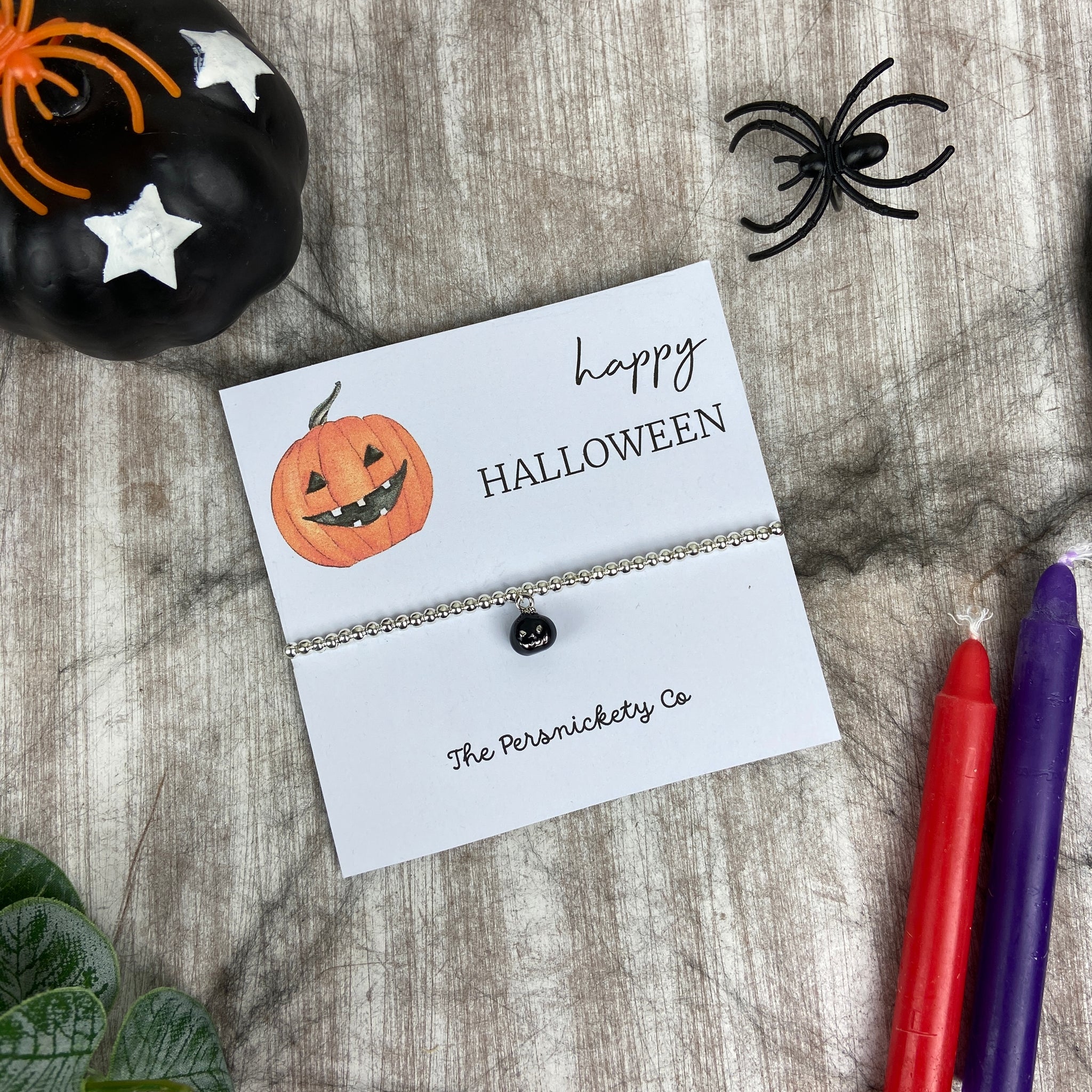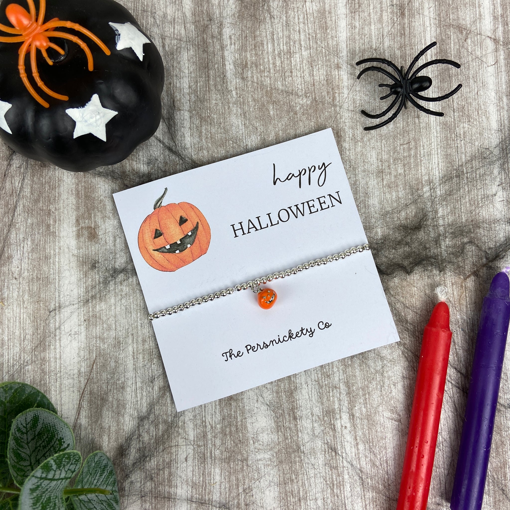 Add a touch of spooky-cute charm to your outfit with this adorable pumpkin beaded bracelet! Featuring a dainty  pumpkin charm available in orange or black strung on a delicate silver-toned beaded bracelet, it’s the perfect accessory to celebrate the Halloween season in style.