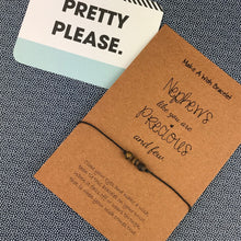 Wish Bracelet - Nephews Like You Are Precious And FewThis handmade wish bracelet would make a perfect little gift for your nephewThe text on the card reads;Simply close your eyes and make a wish, then tie this bracelet on your wrist. When it falls off or wears through, that is when your wish comes true. Each handmade bracelet comes tied onto a craft card (approx. 105 x 148mm) which is 100% recycled and is individually presented in it's own little self seal bag. The wooden beads are tied onto a 1mm black wax cord