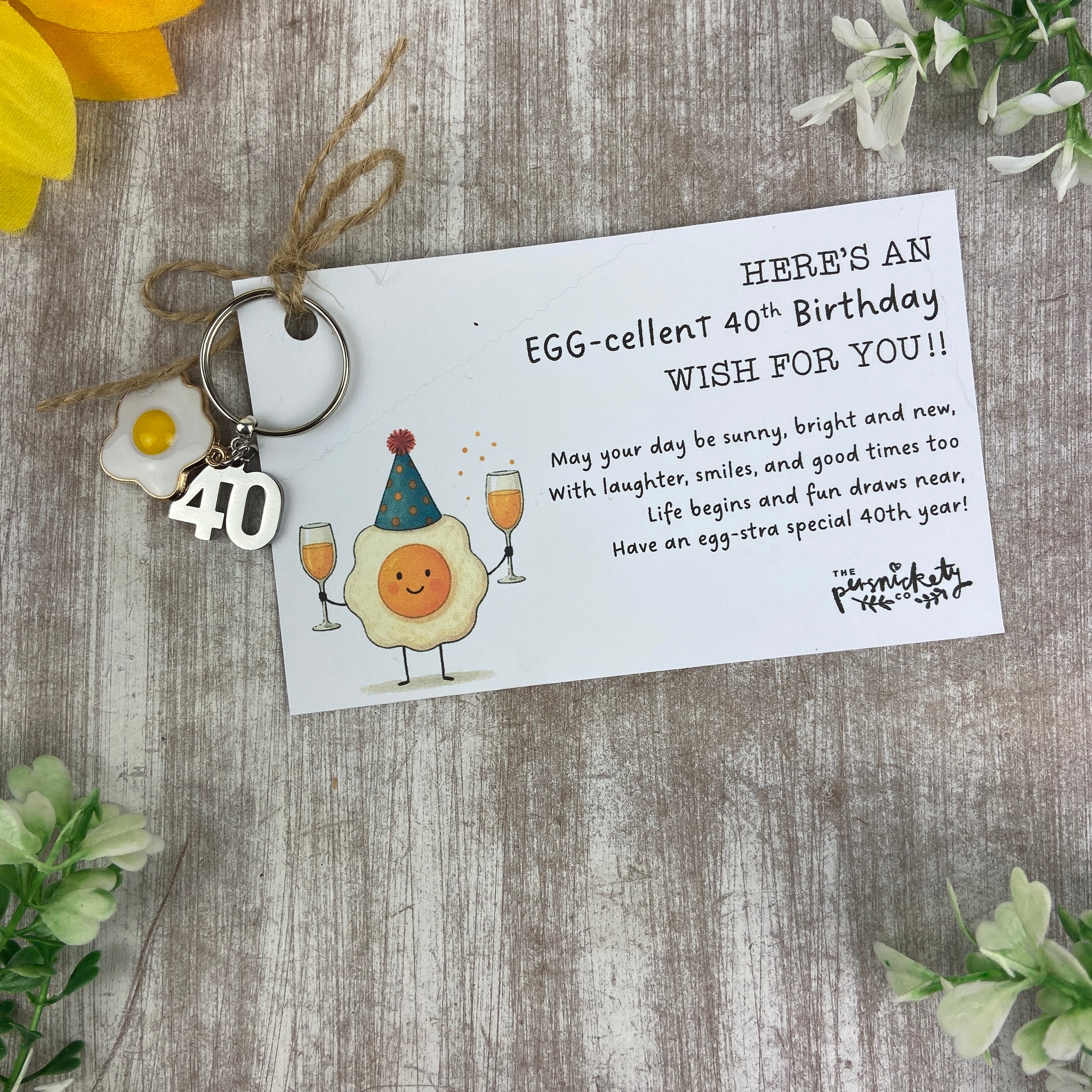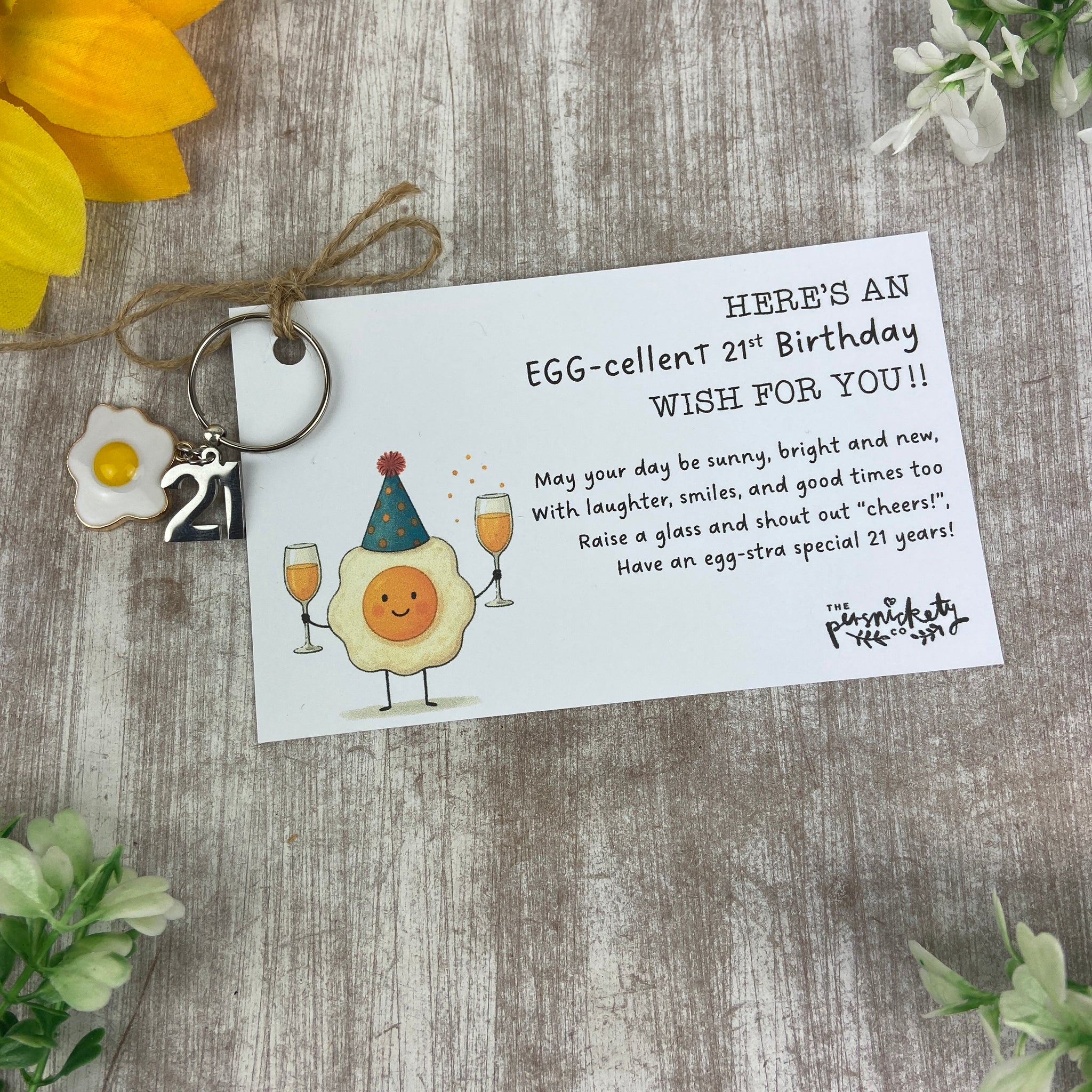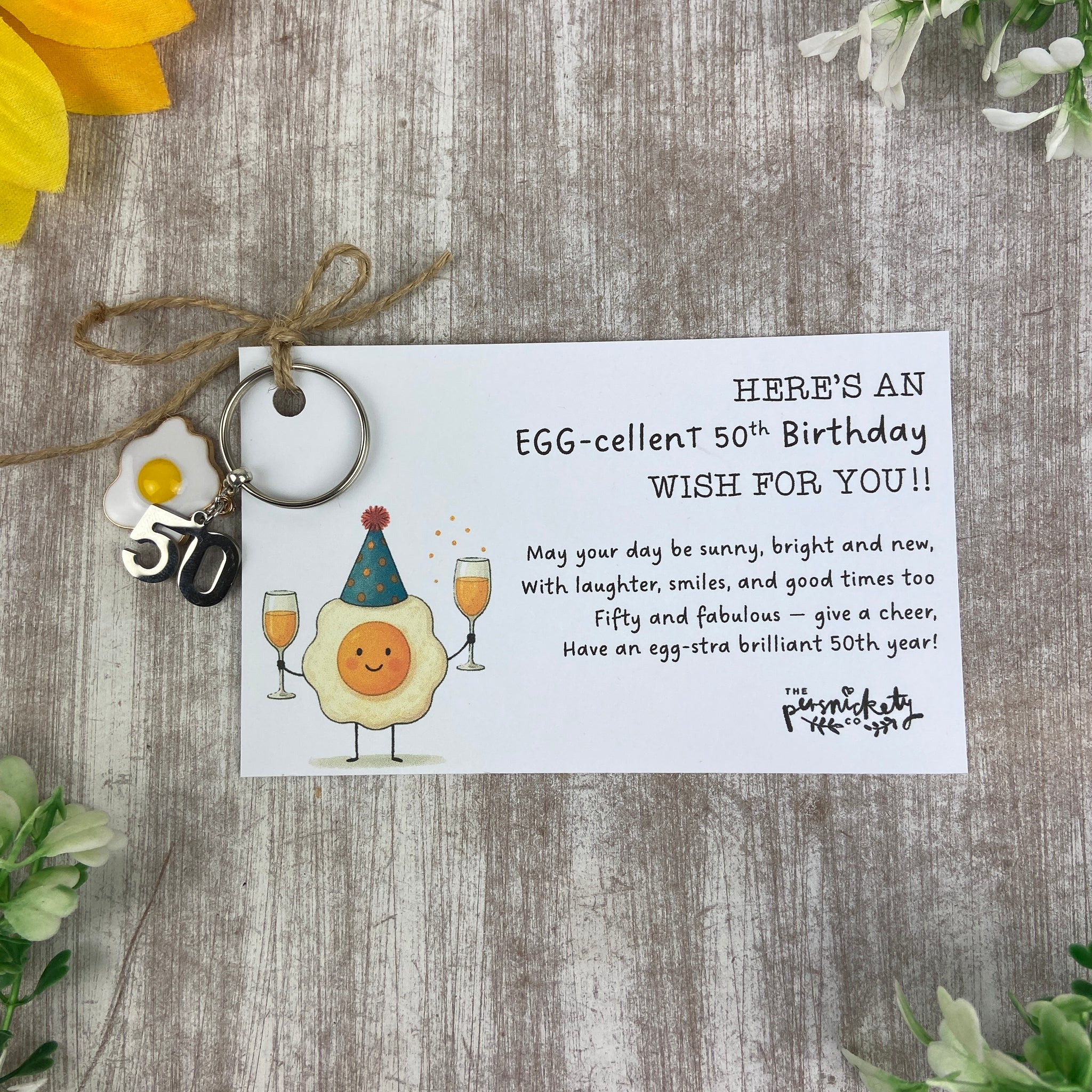 Each keyring features a cute fried egg charm and a birthday number (18, 21, 30, 40 or 50), presented on a fun illustrated card with a light-hearted birthday poem — perfect for anyone who loves a good pun!