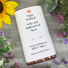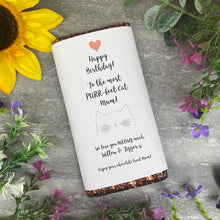 What a lovely gift for the most purr-fect cat mum or dad on their Birthday!These 130gsm Galaxy bars are wrapped in a 130gsm glossy paper and can be personalised for an extra special gift.You can choose from a smooth Galaxy Bar or a Caramel Galaxy Bar - Please select from the dropdown.Please leave the name that you would like adding to the chocolate bar.