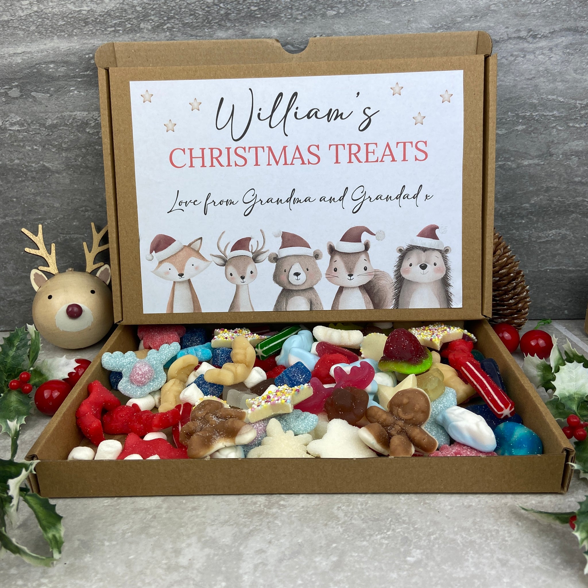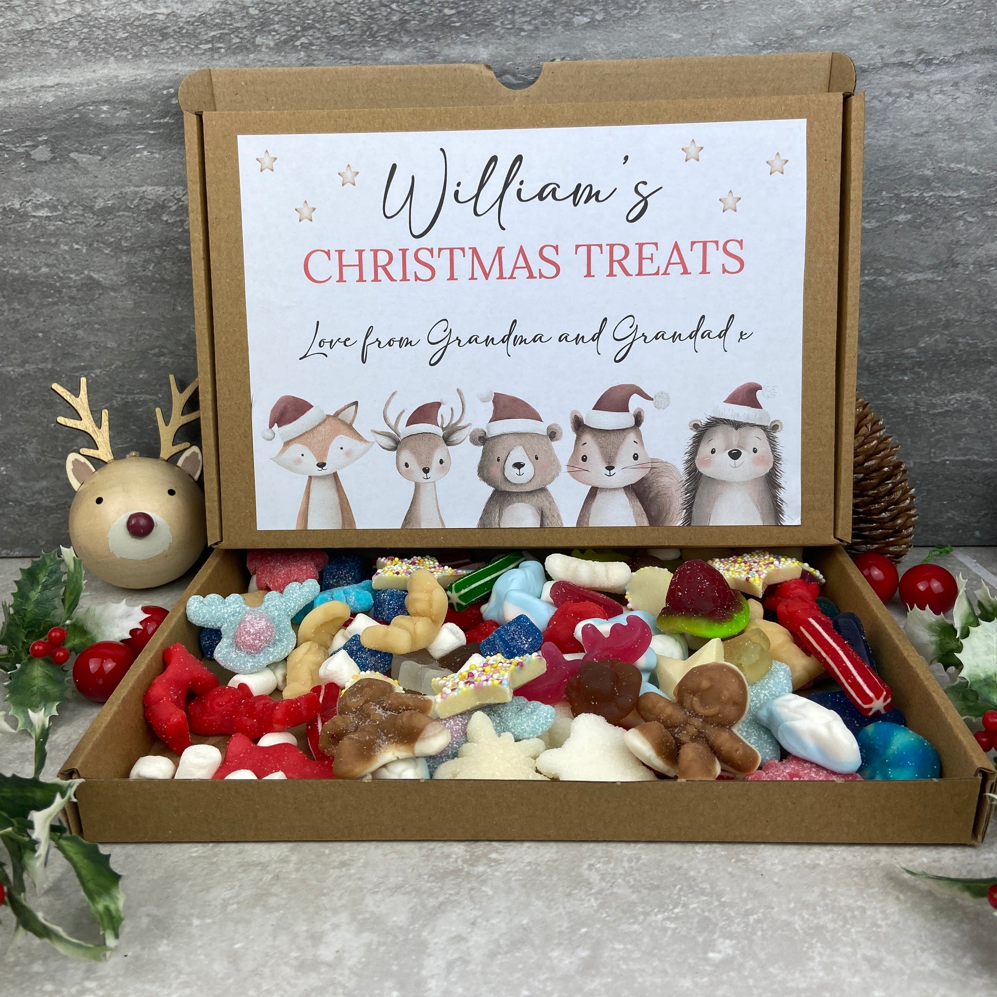 Each box features our adorable Festive Friends – including the fox, reindeer, bear, squirrel and hedgehog – all ready for the holidays in their Santa hats. It’s a joyful, personalised gift that brings smiles (and sugar!) all season long.