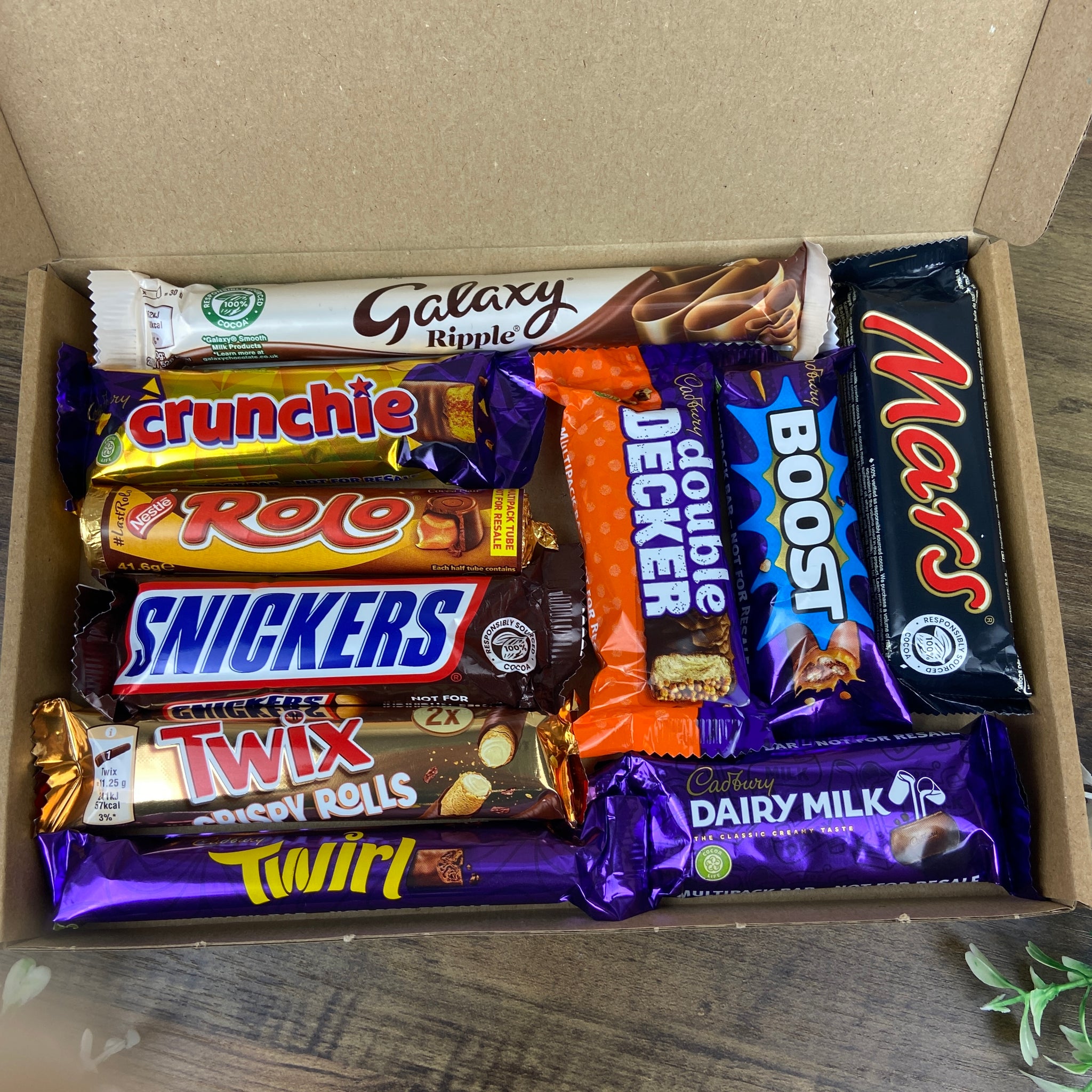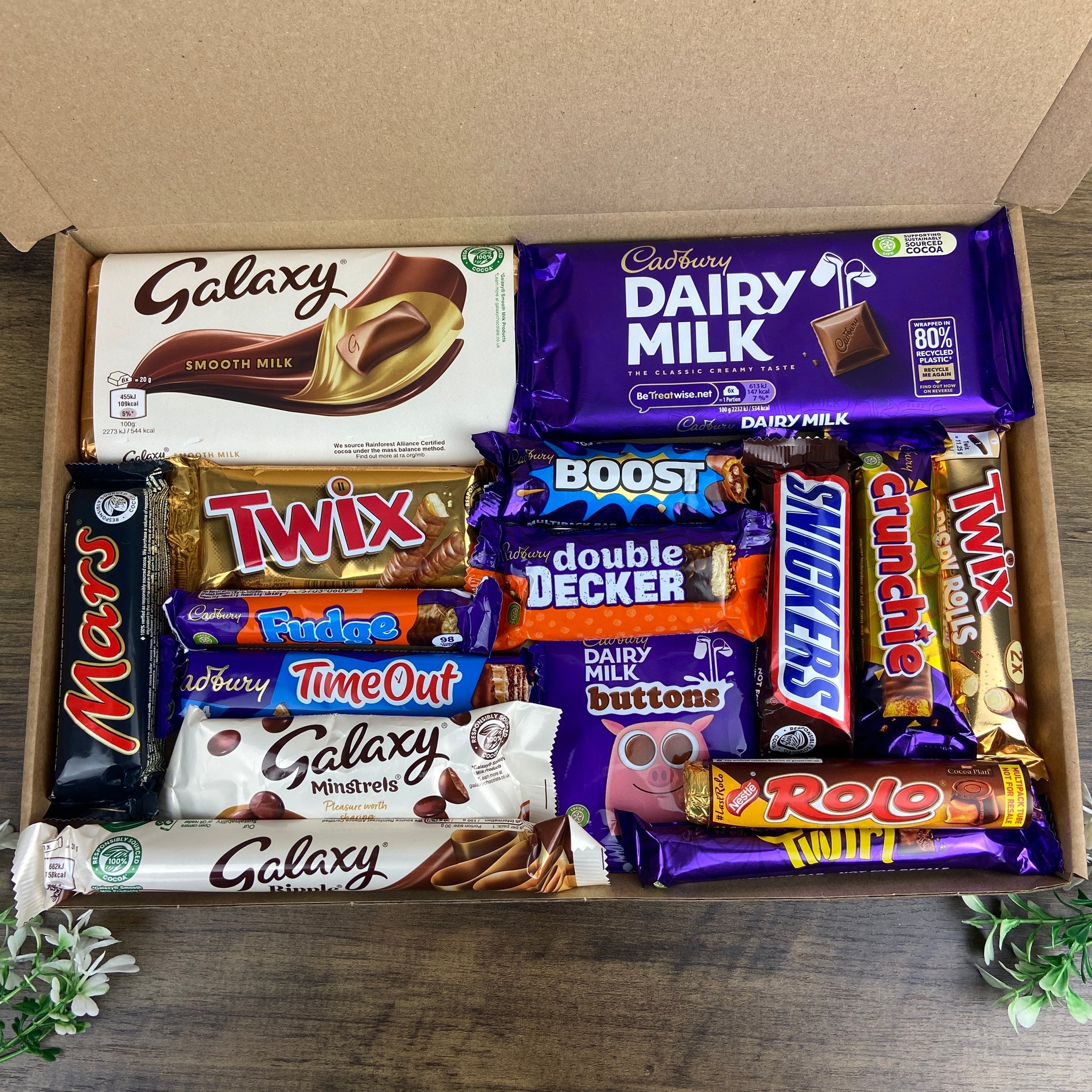 A delicious assortment of well-loved favourites (e.g., Dairy Milk, Twix, Snickers, Crunchie etc).