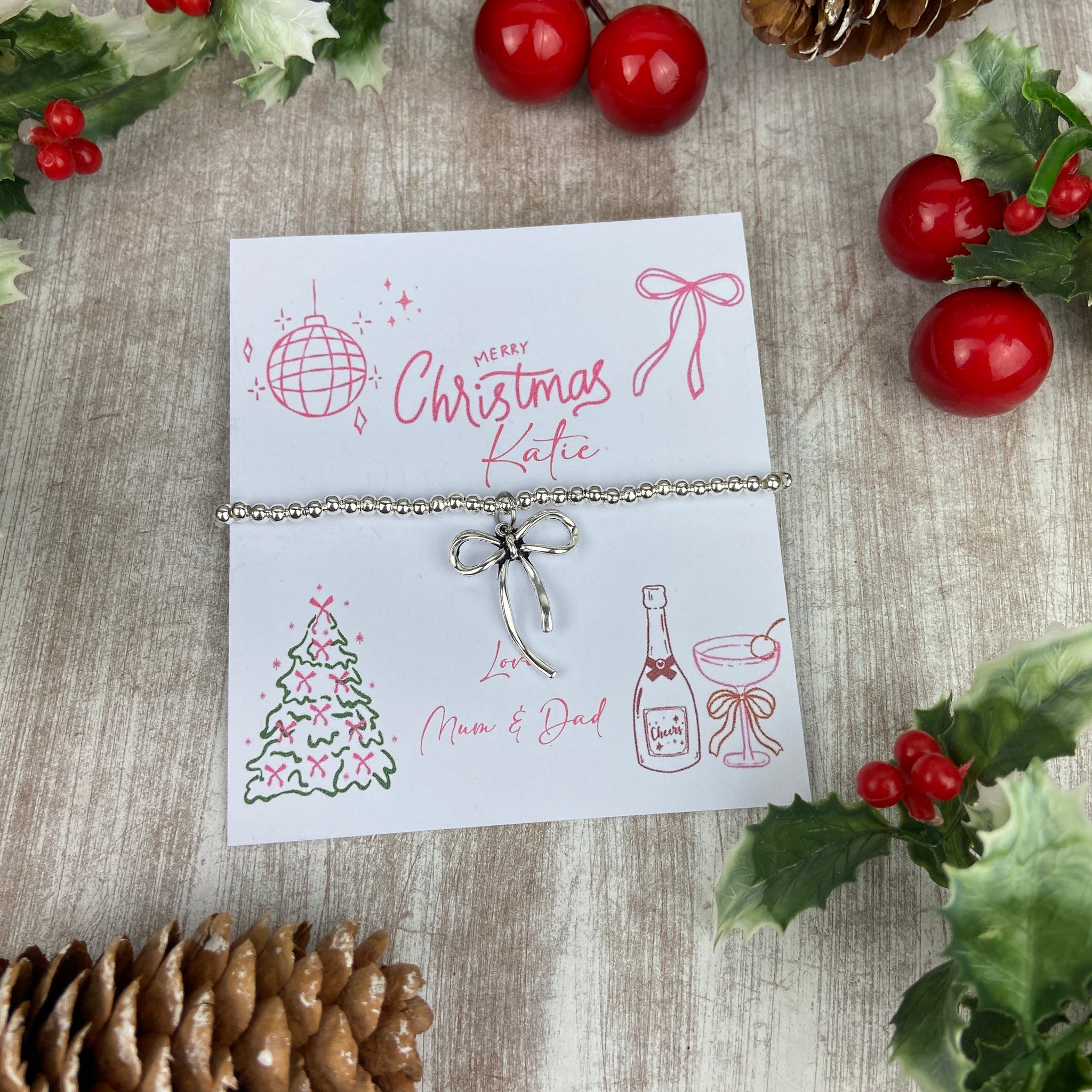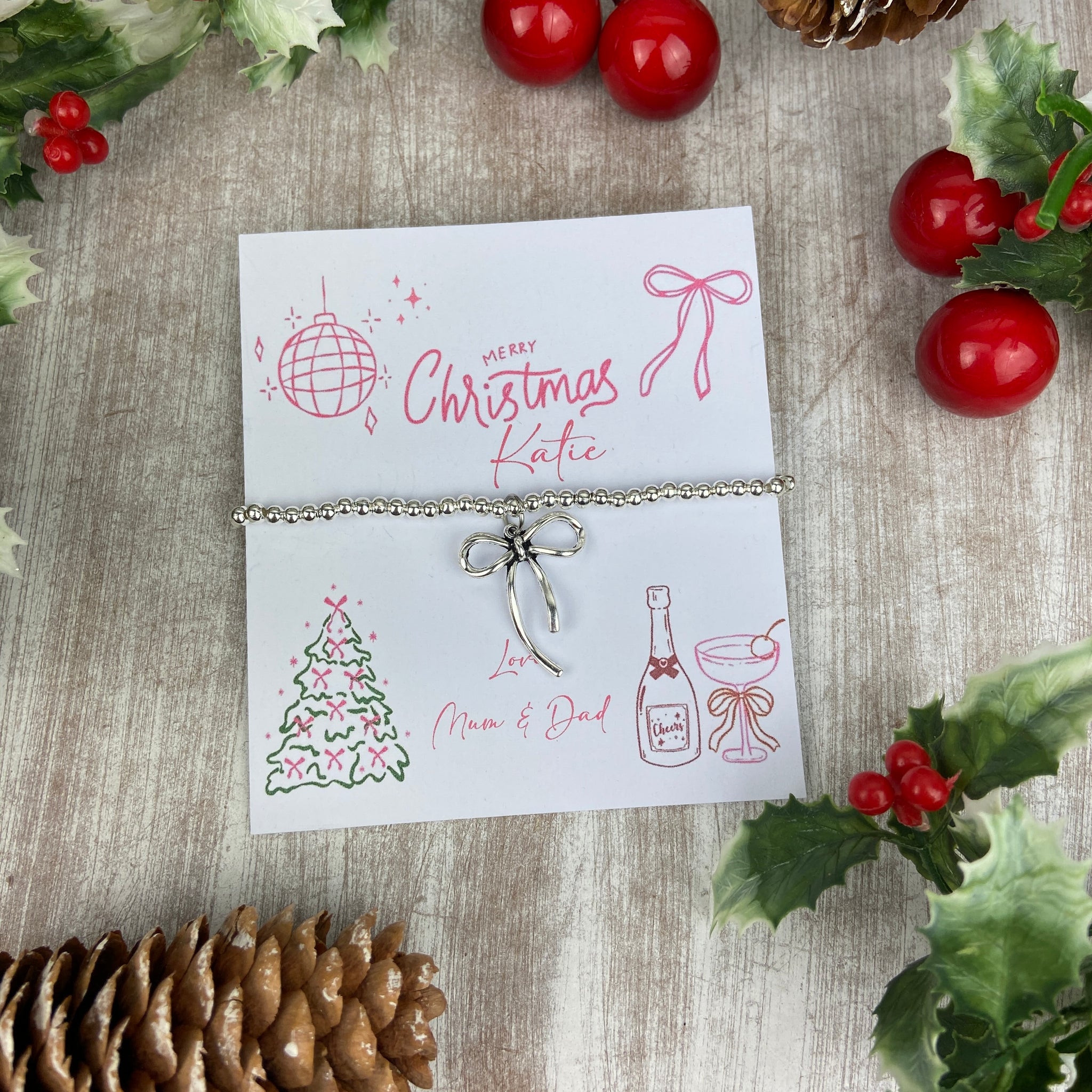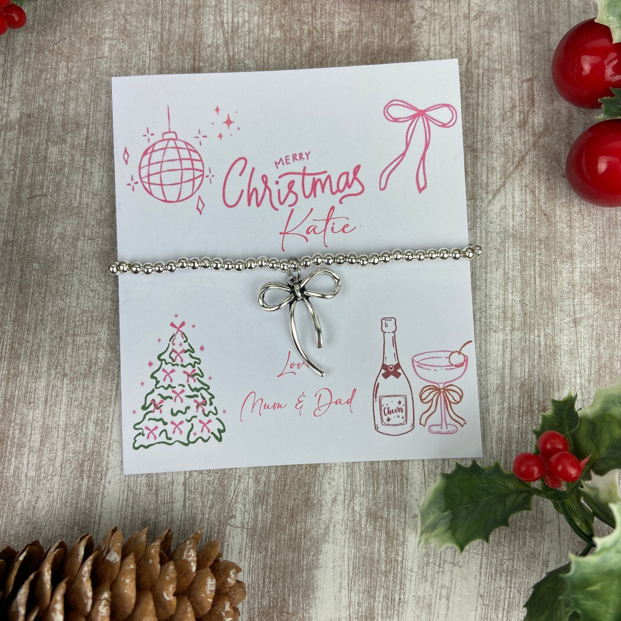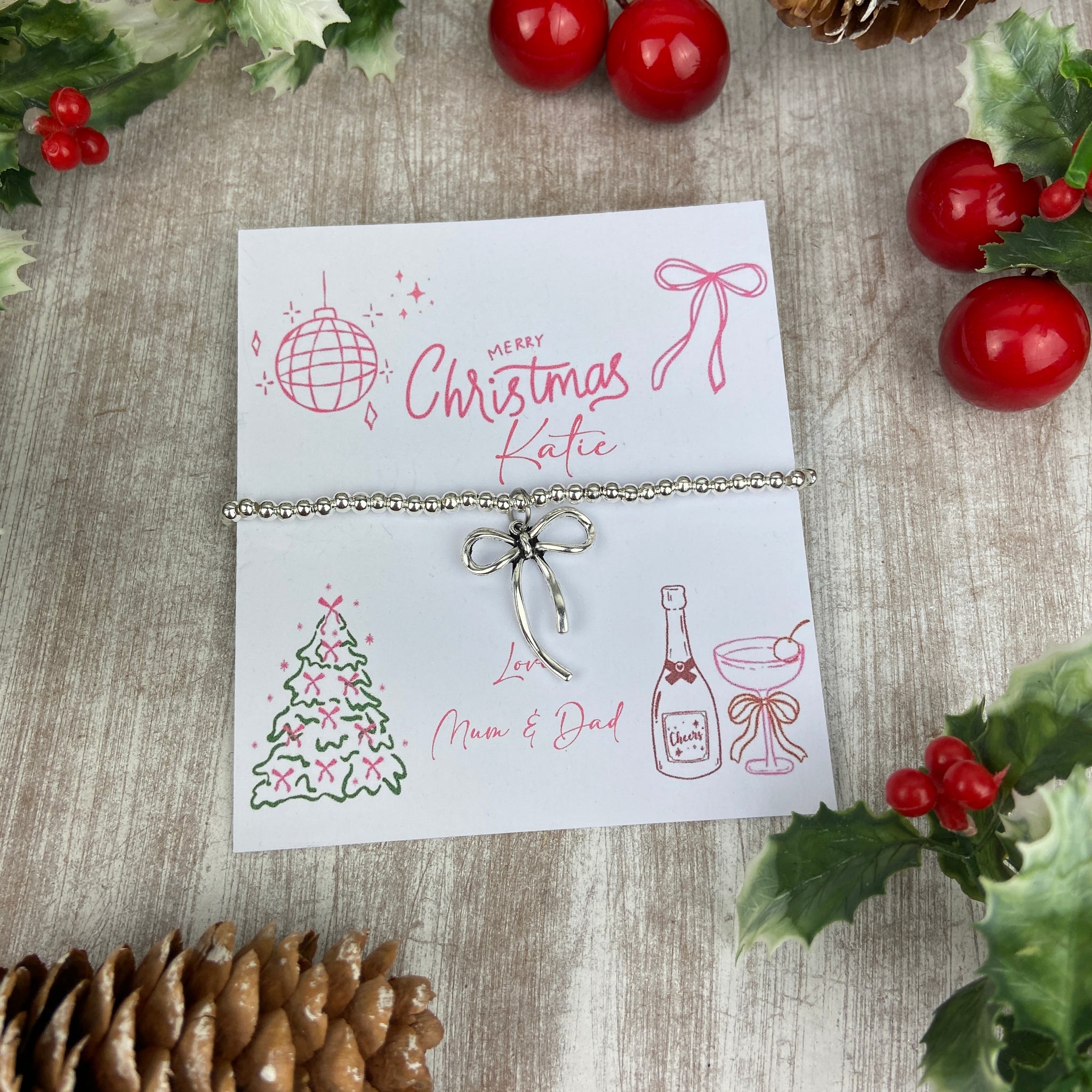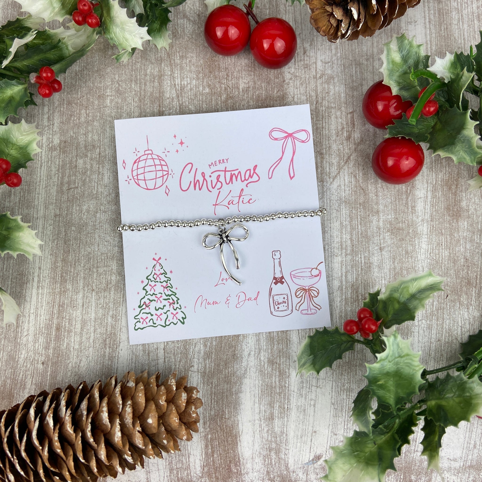 Each bracelet features dainty silver plated beads and a charming bow charm, symbolising love, joy, and the simple delight of giving. Presented on a sweetly illustrated festive card, it makes a thoughtful Christmas gift for a daughter, friend, or loved one.