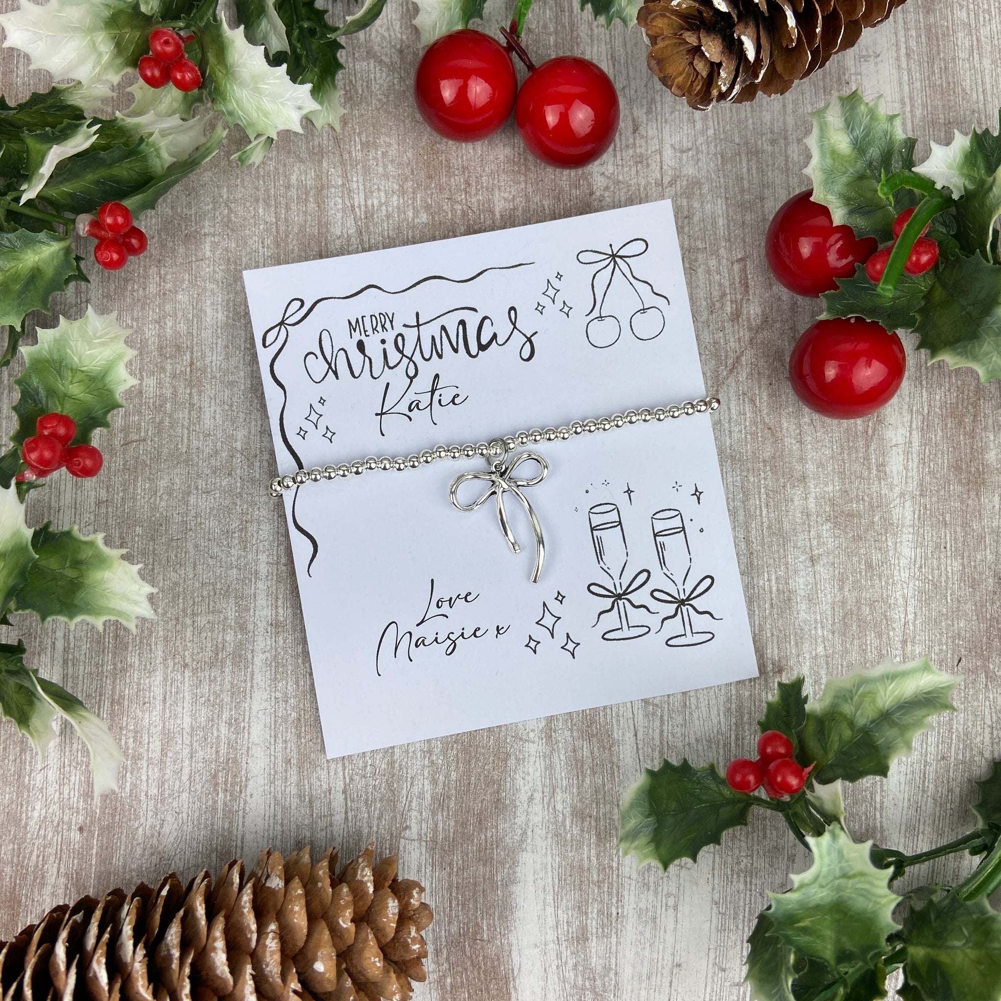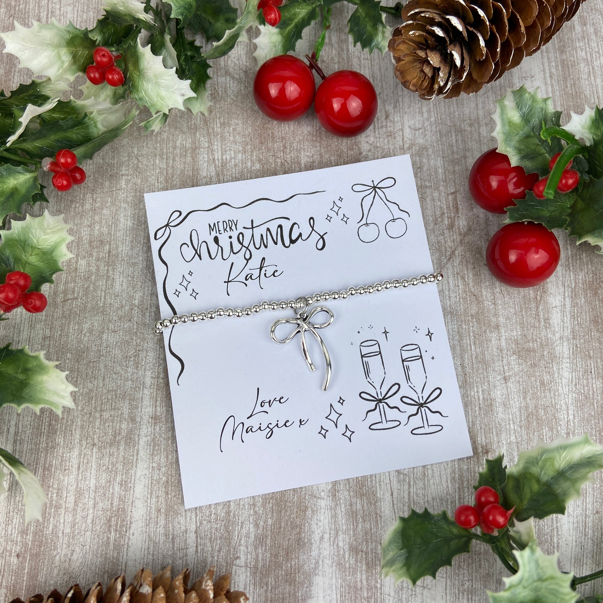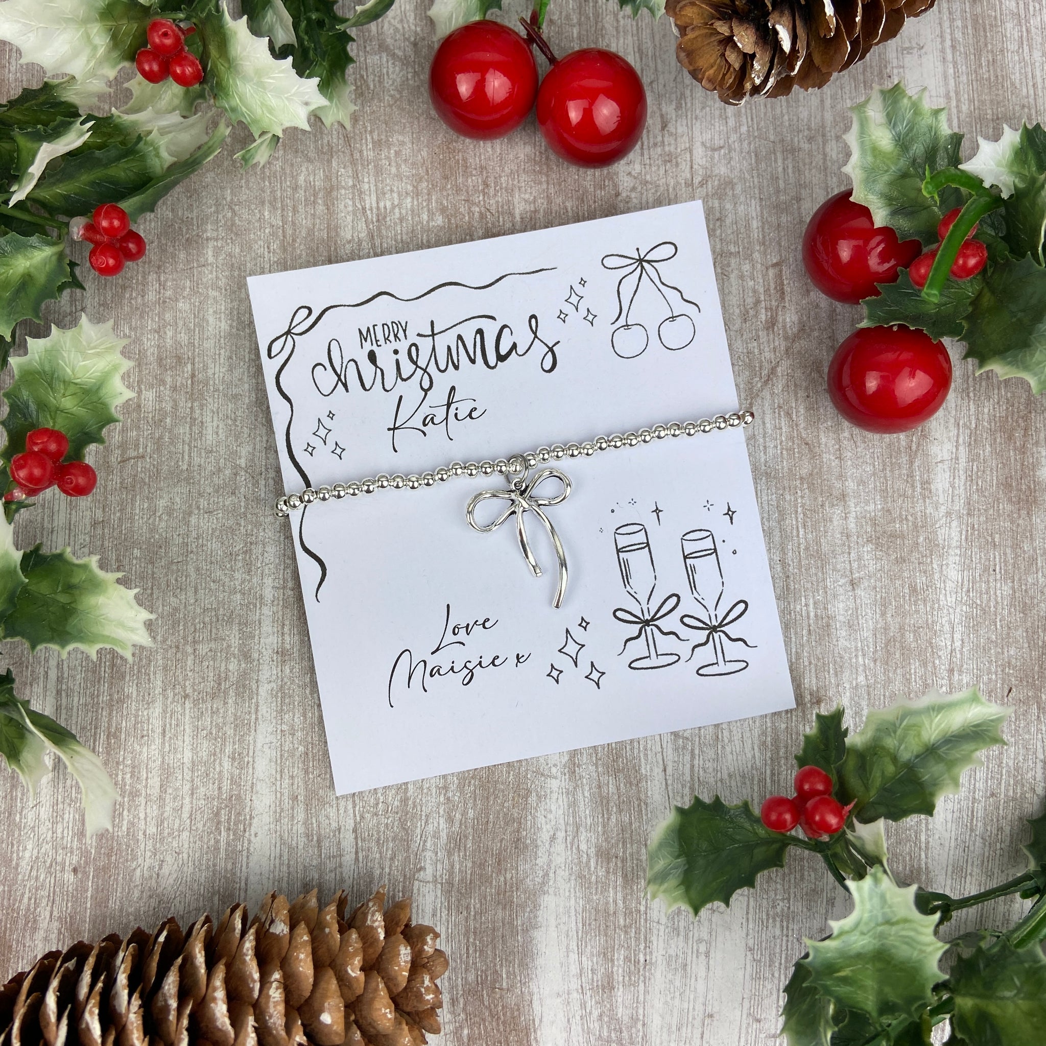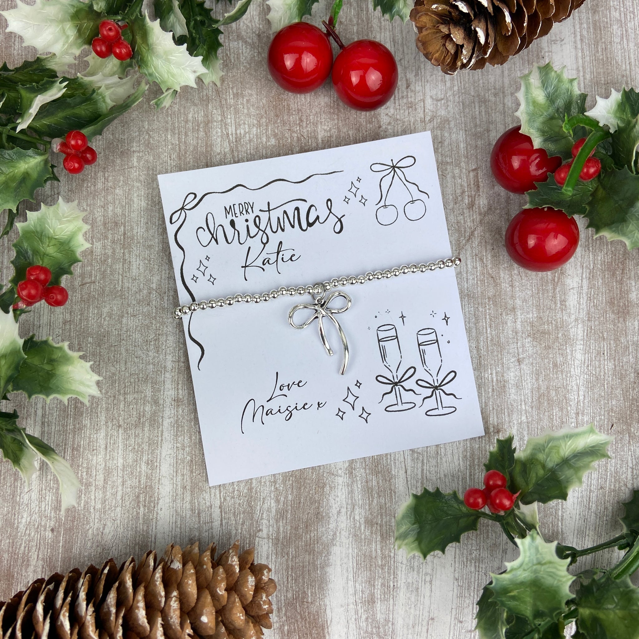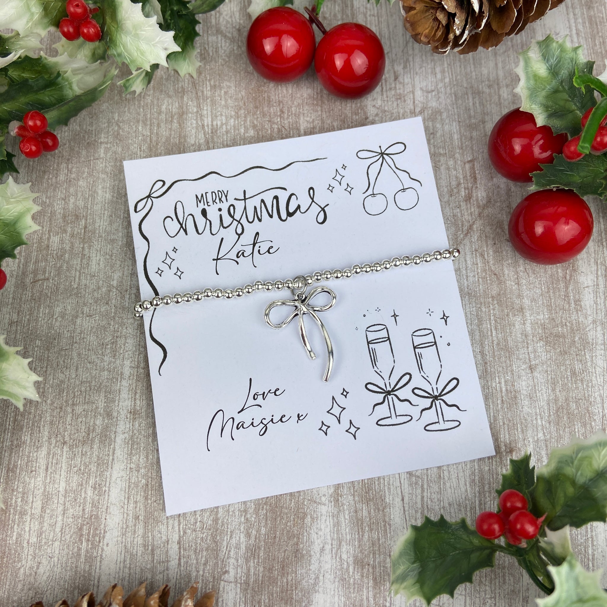 Each bracelet features dainty silver plated beads and a charming bow charm, symbolising love, joy, and the simple delight of giving. Presented on a sweetly illustrated festive card, it makes a thoughtful Christmas gift for a daughter, friend, or loved one.
