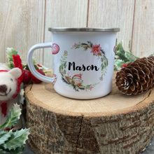 This beautiful personalised 12oz Enamel Mug features a gorgeous Snow Boy Wreath design and is personalised with your chosen name.
