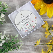 This ornament is printed with the quote 'Mum My first friend, best friend, forever friend' and can be personalised with any name.