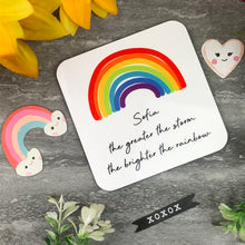 These lovely coasters make a perfect little personalised gift featuring the quote 'The Greater The Storm, The Brighter The Rainbow'