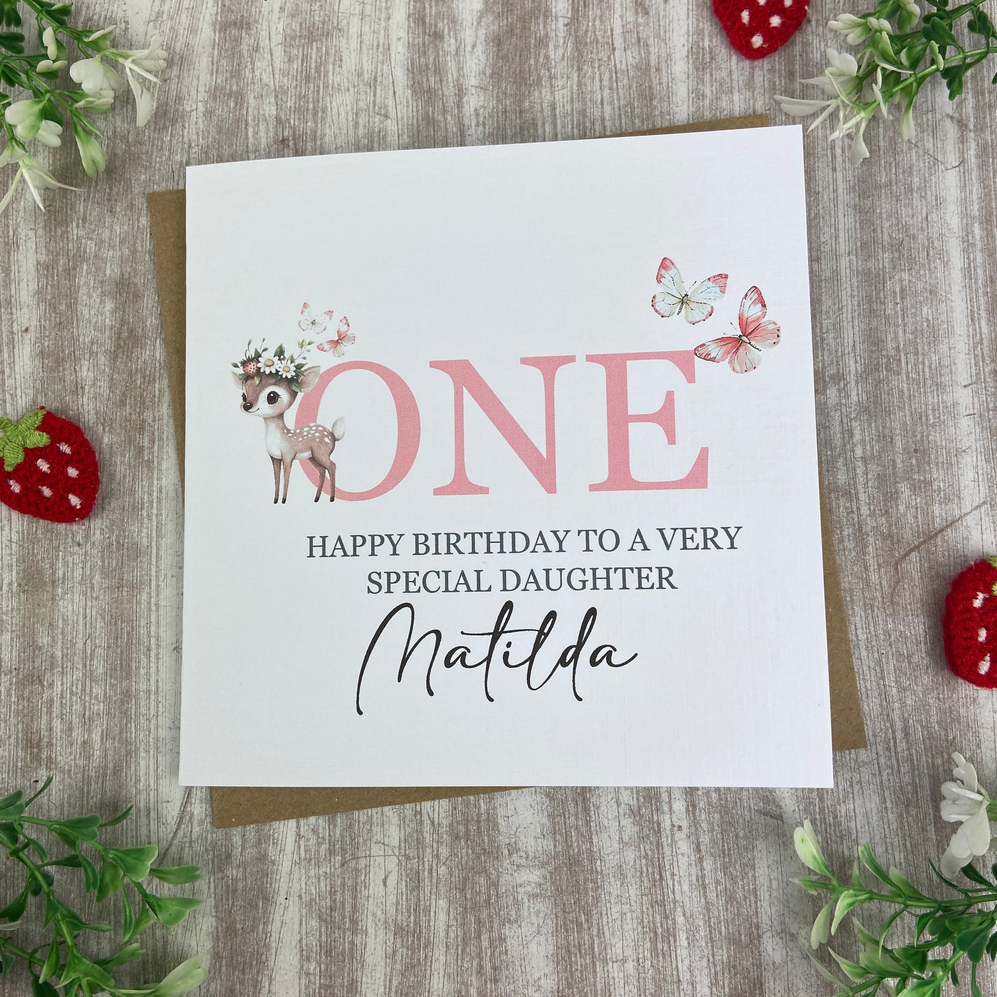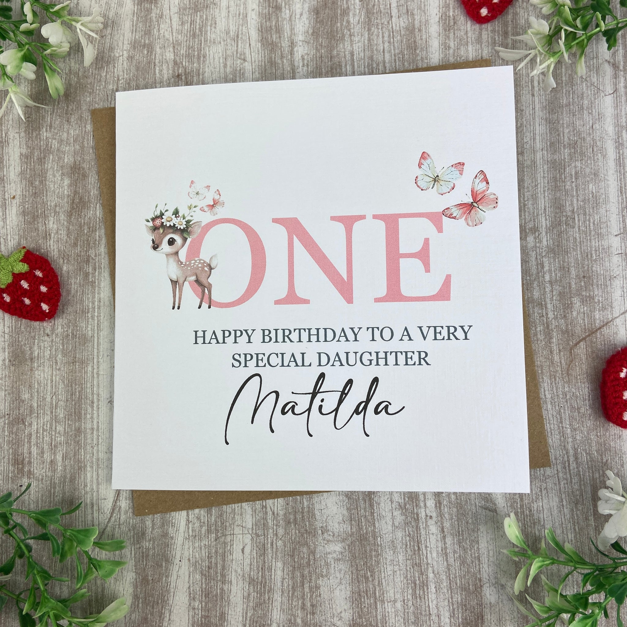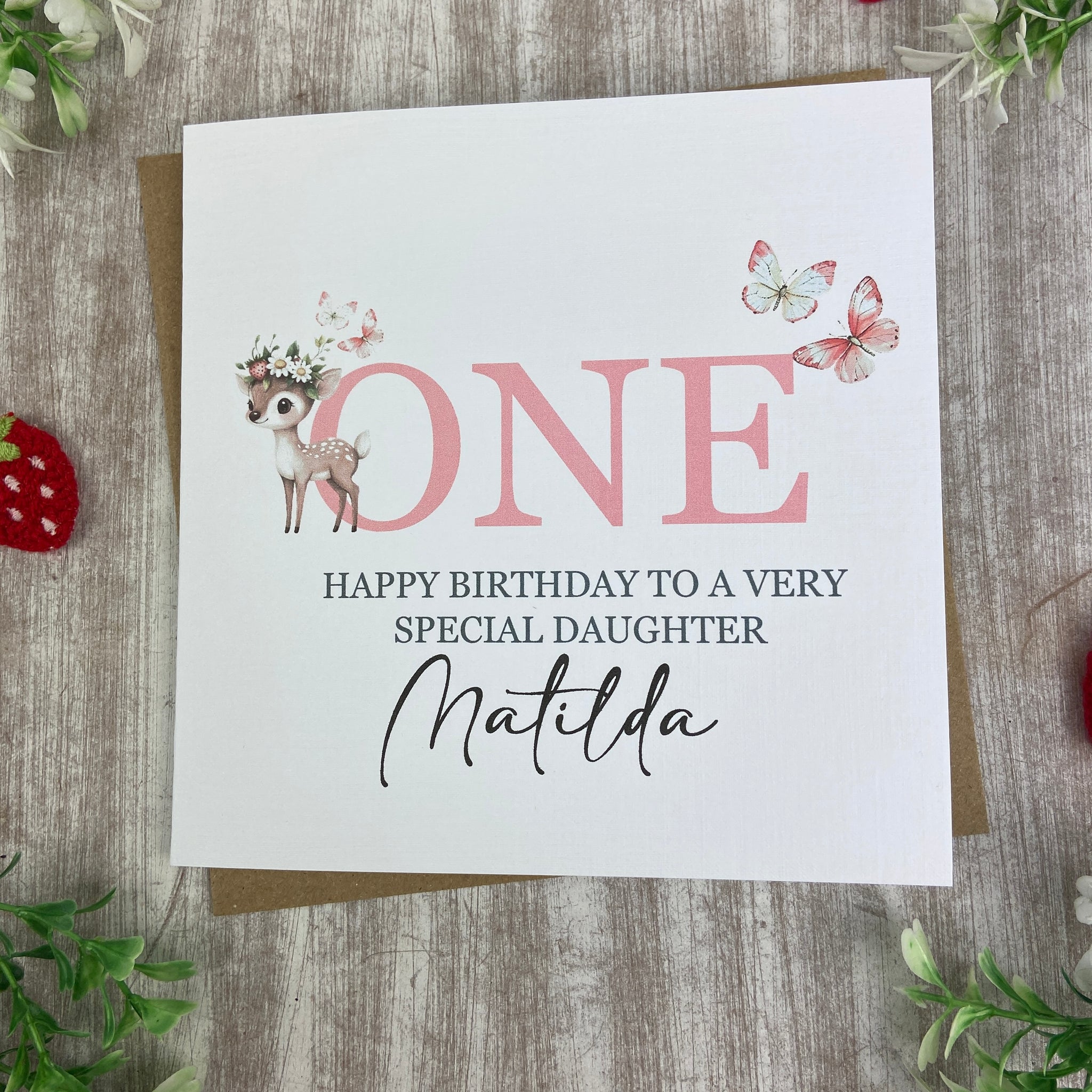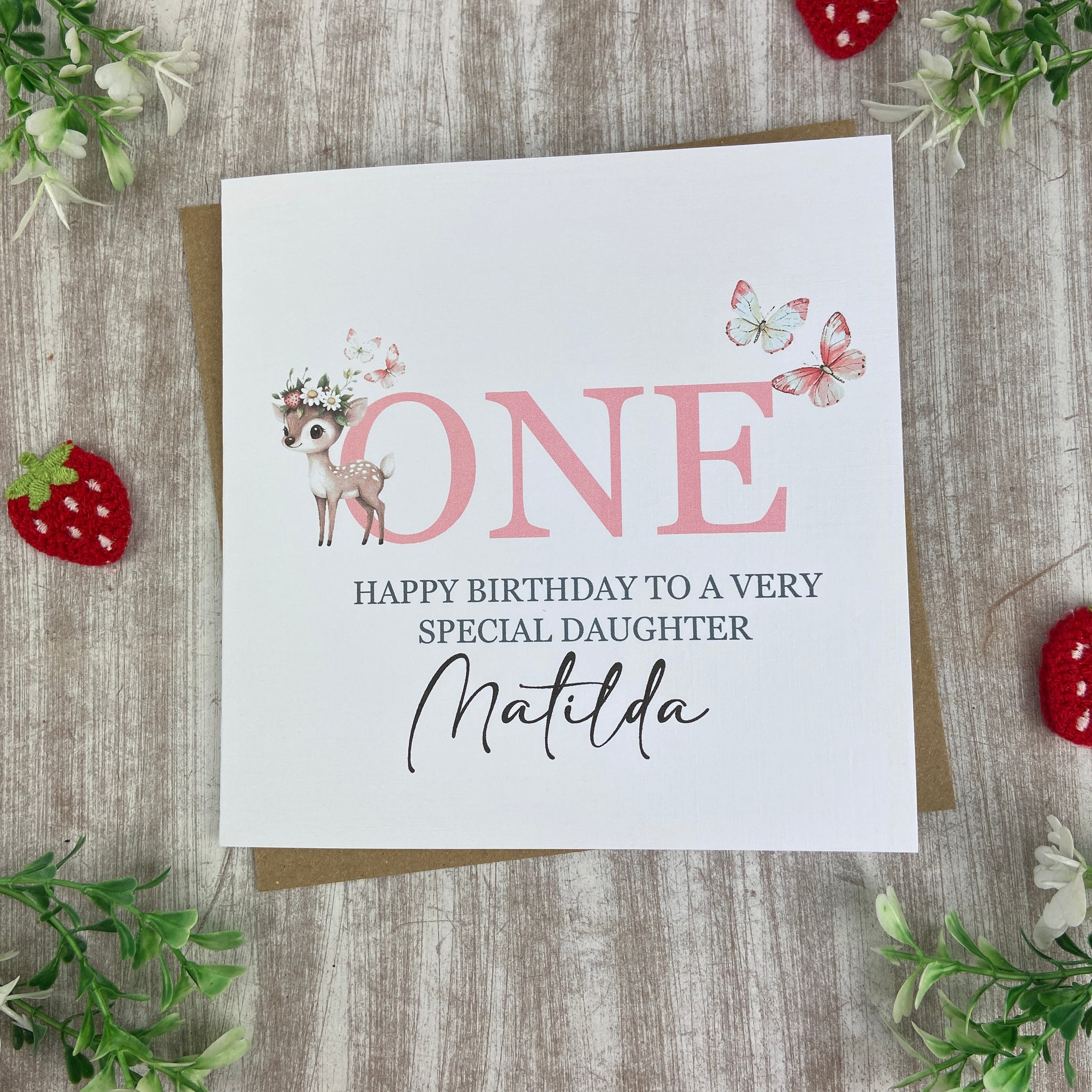 🌿 Personalised 1st Birthday Card for Girl – Woodland Deer Design 🌿