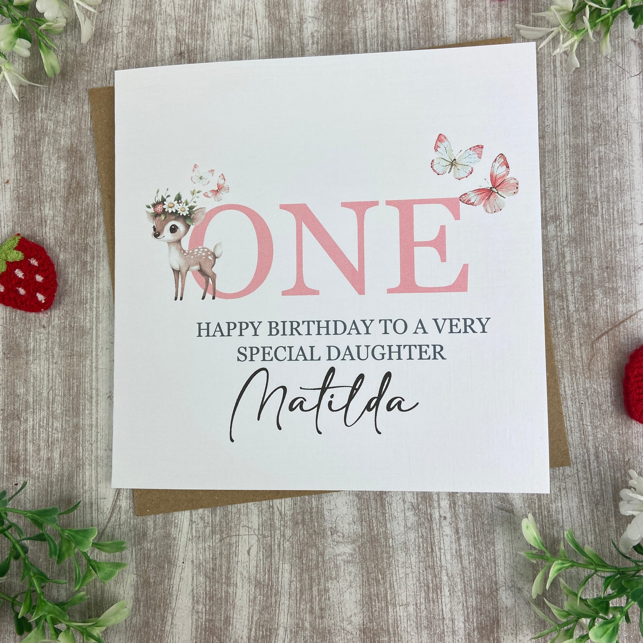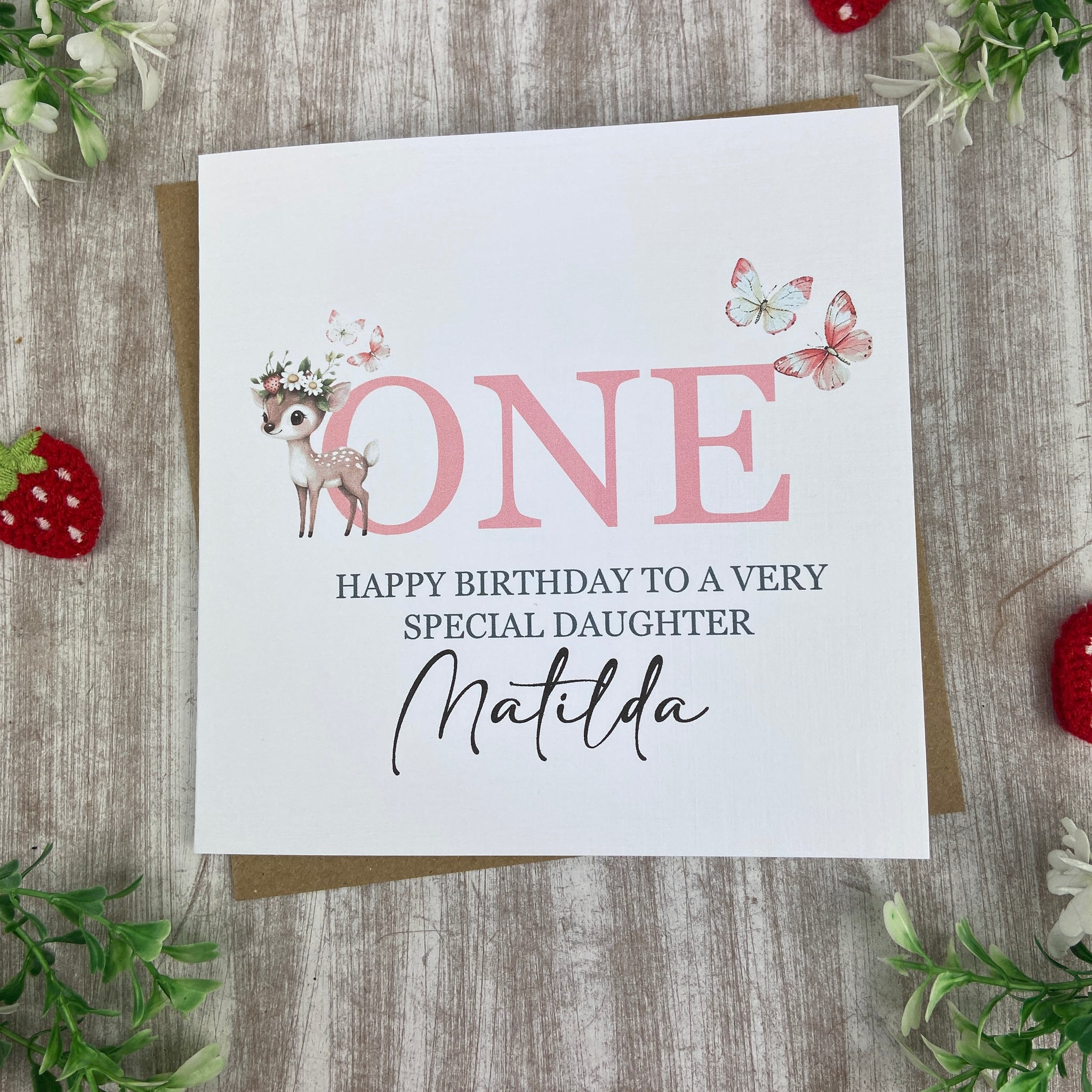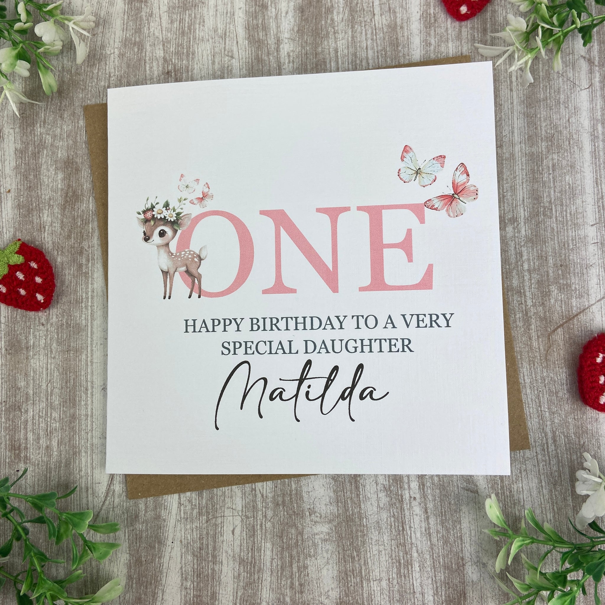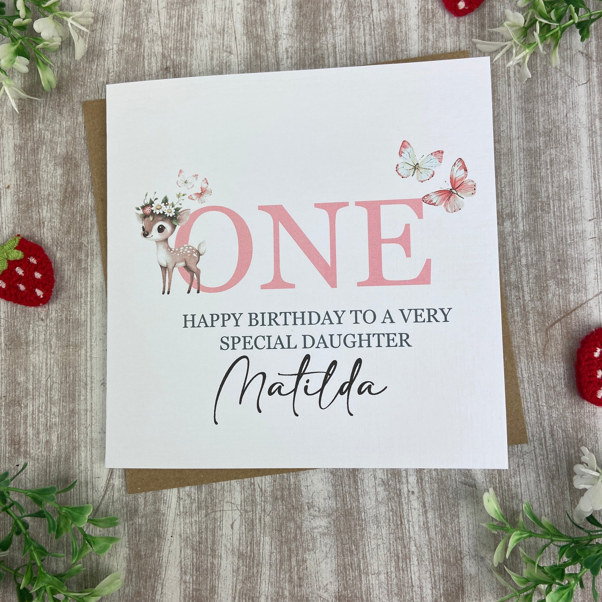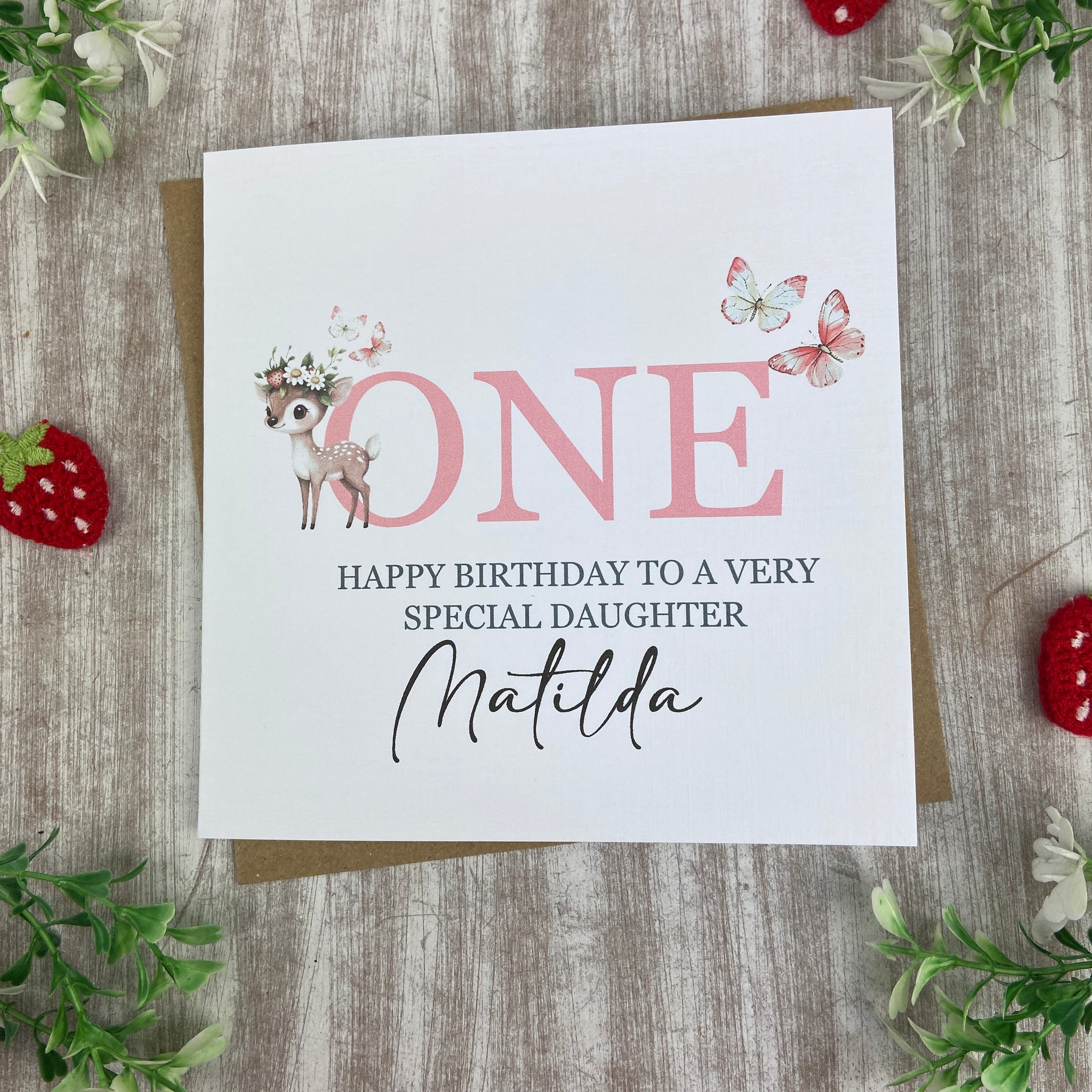🌿 Personalised 1st Birthday Card for Girl – Woodland Deer Design 🌿