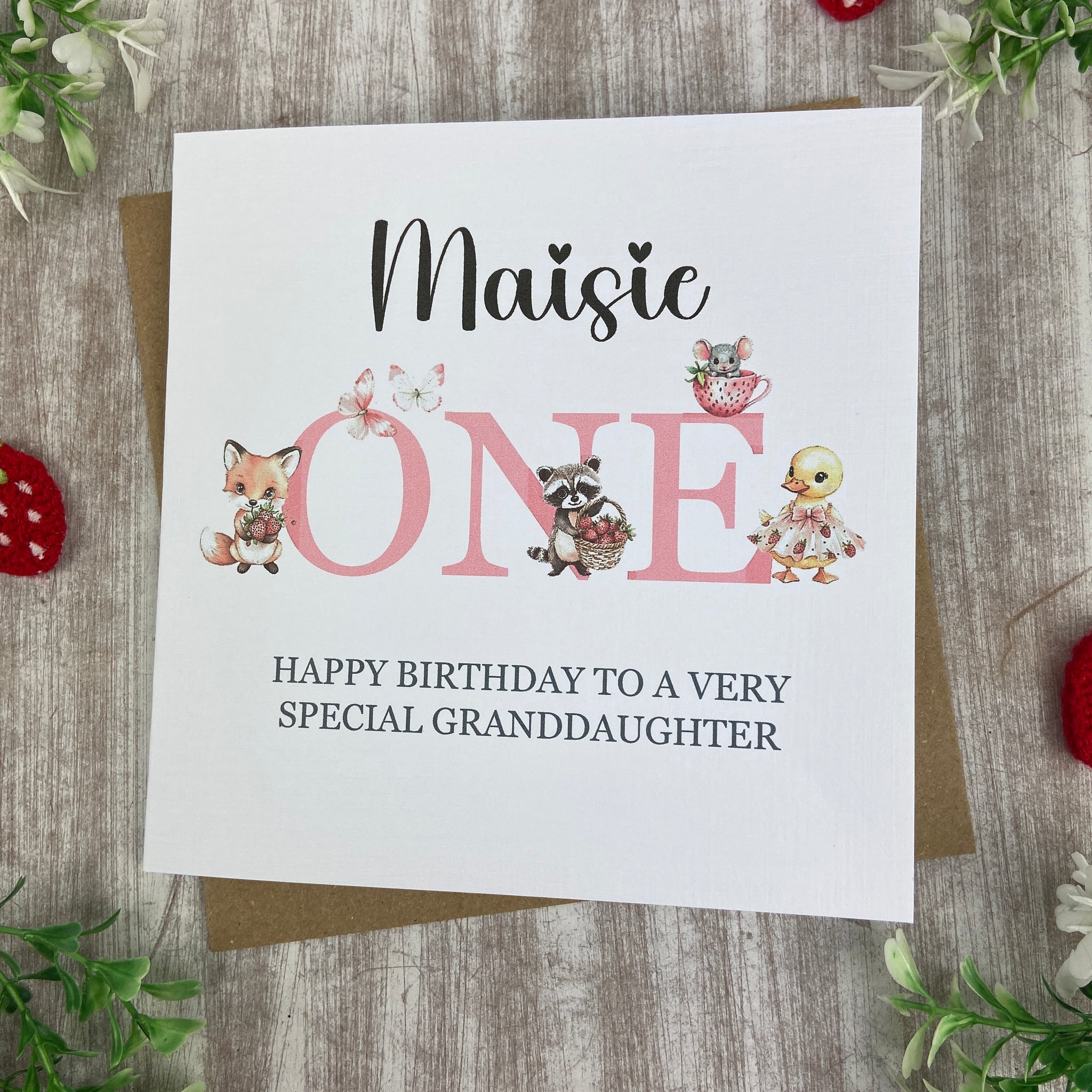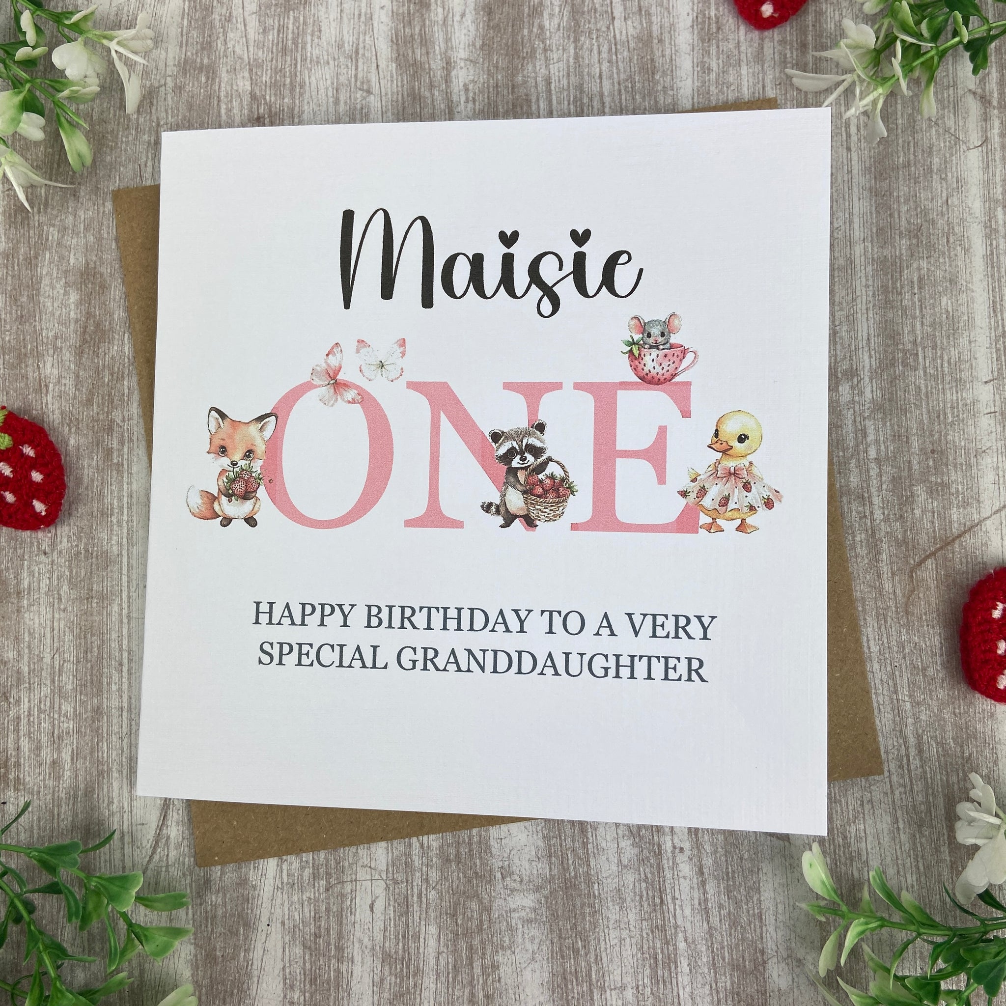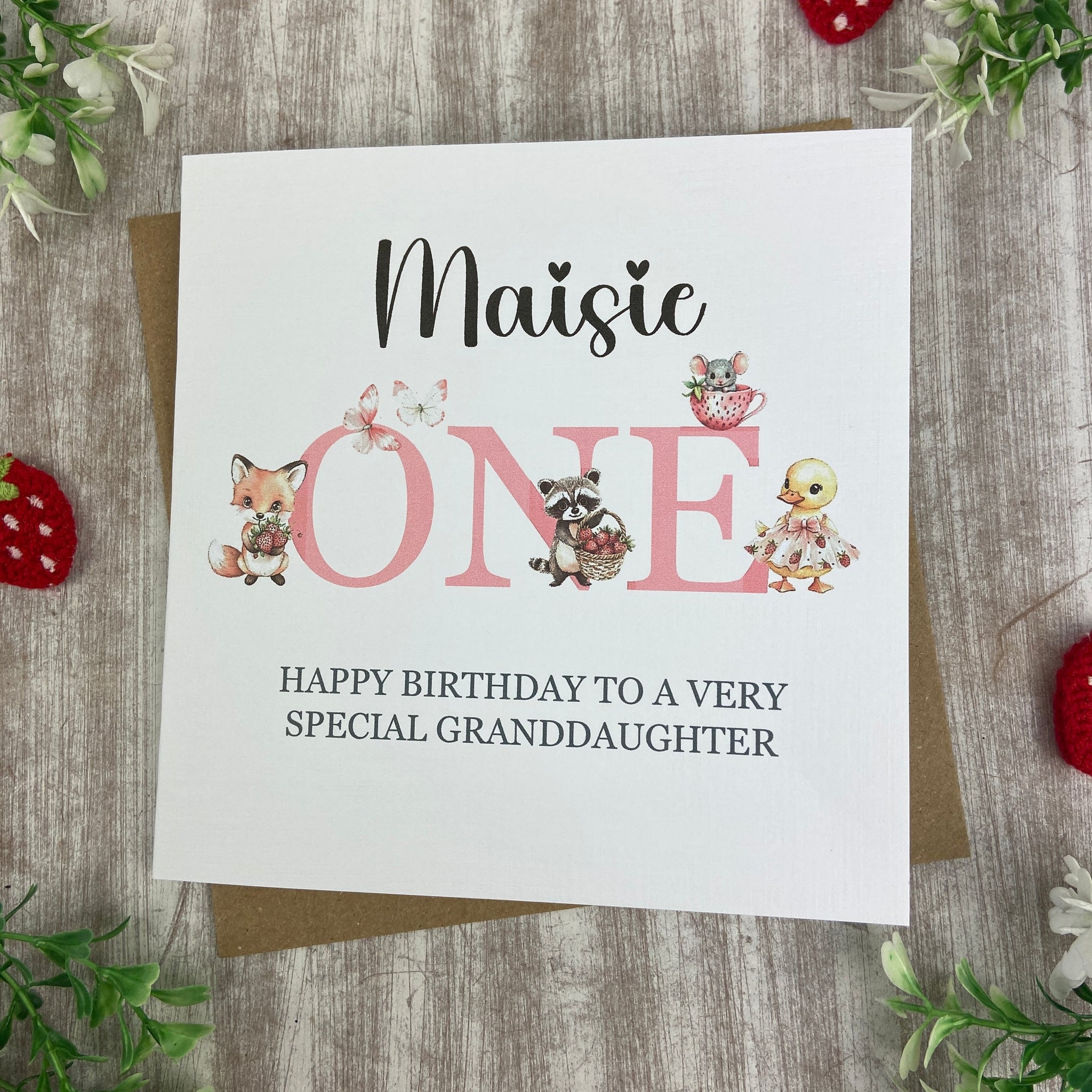 Celebrate her first birthday with this adorable personalised 1st birthday card featuring a cute collection of woodland animals — including a fox, raccoon, duckling and mouse. The soft pastel design and sweet details make it the perfect keepsake for a special granddaughter, daughter, niece or goddaughter.