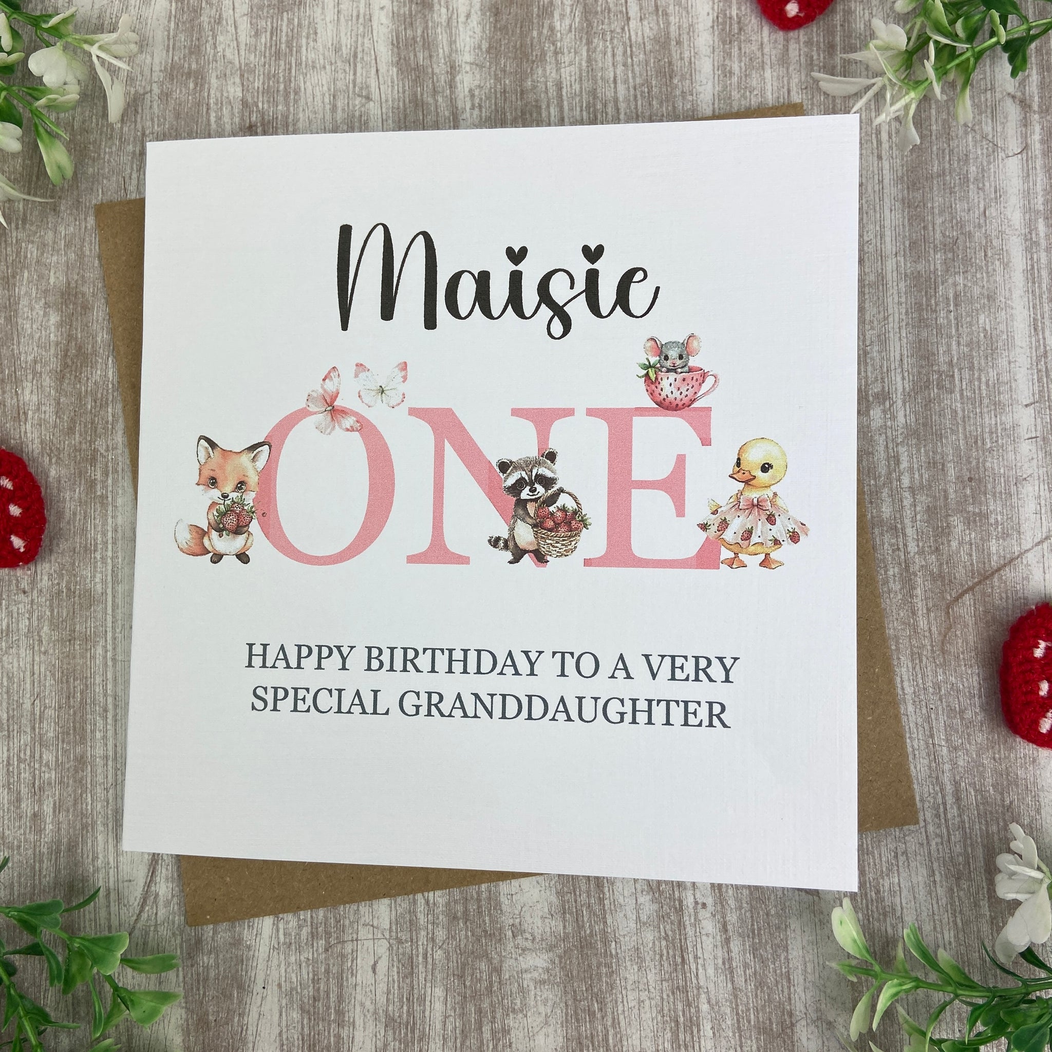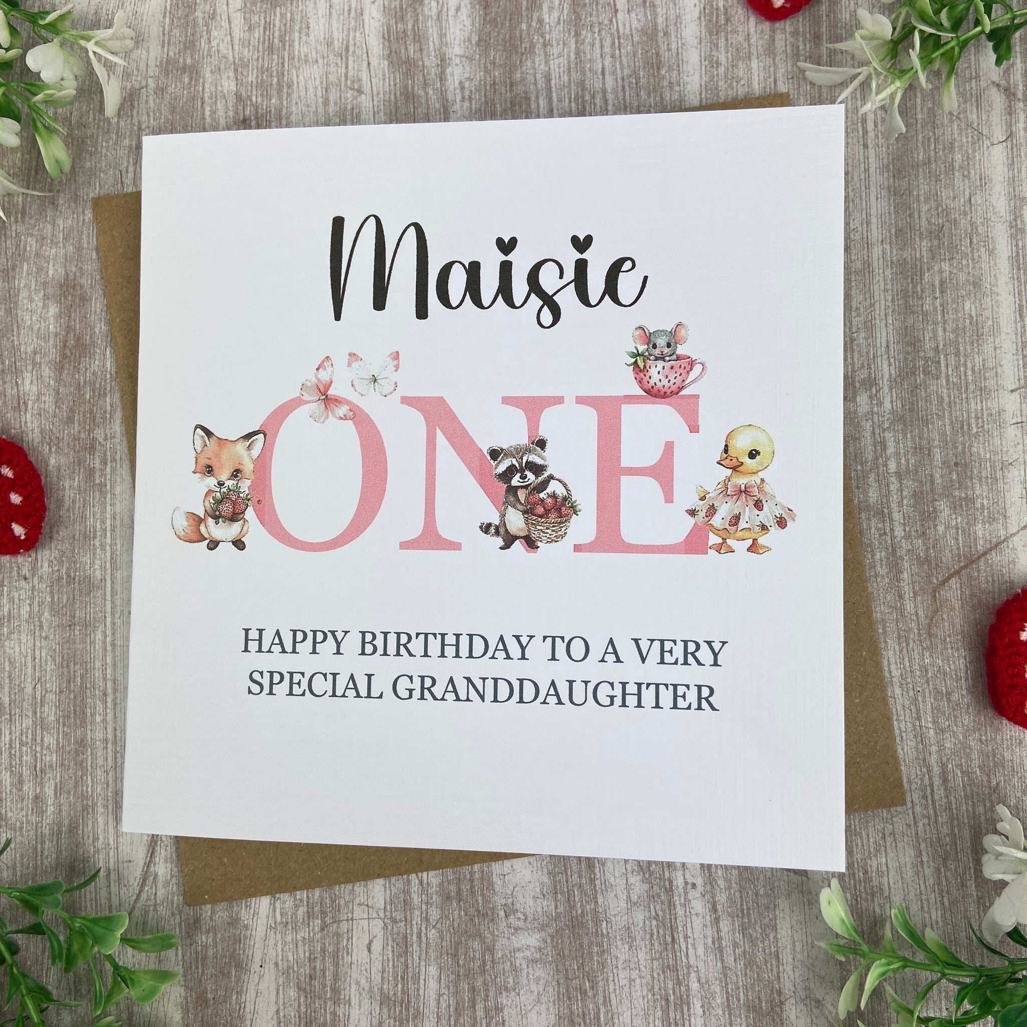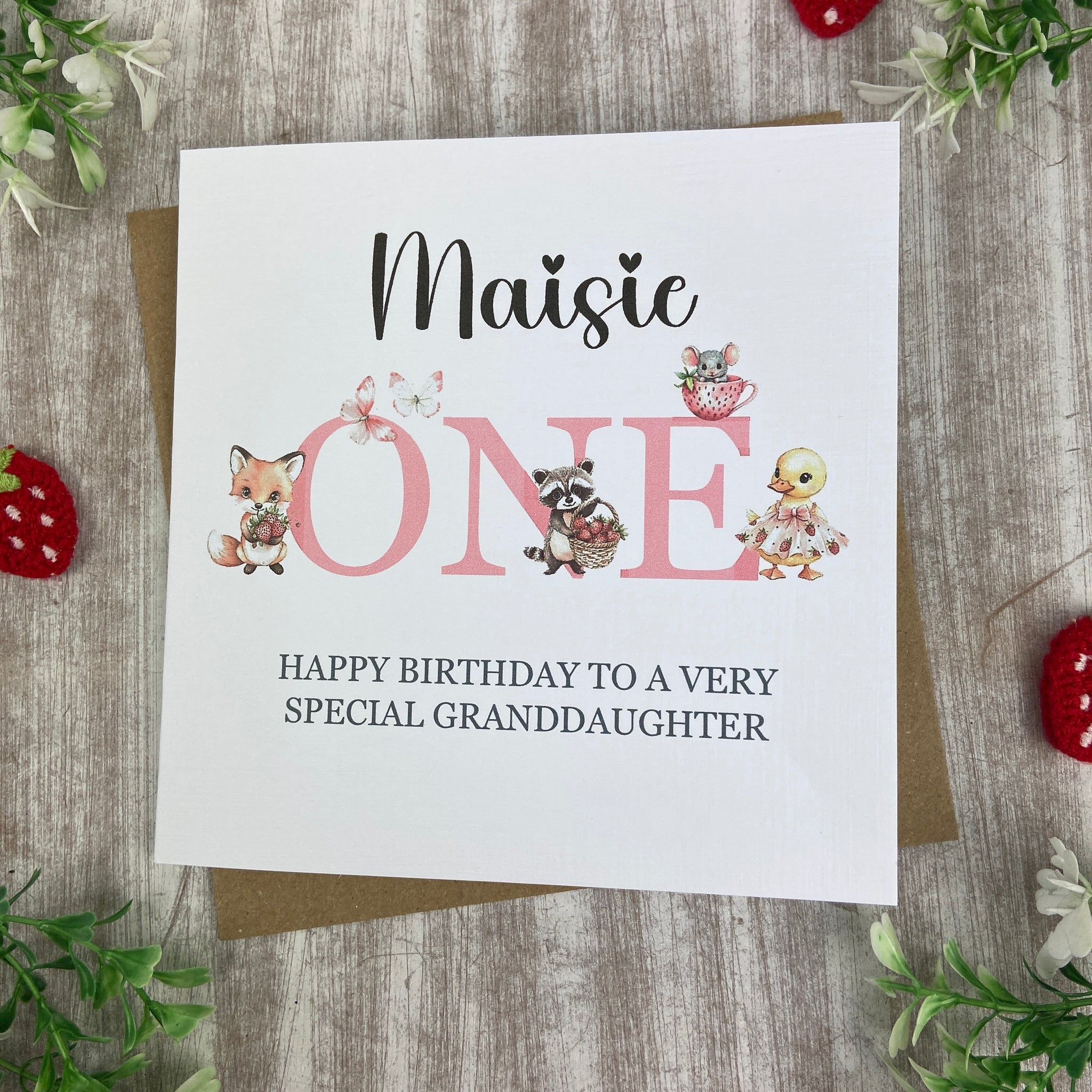 Celebrate her first birthday with this adorable personalised 1st birthday card featuring a cute collection of woodland animals — including a fox, raccoon, duckling and mouse. The soft pastel design and sweet details make it the perfect keepsake for a special granddaughter, daughter, niece or goddaughter.