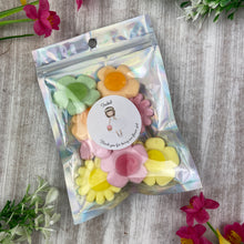 They contain a colourful selection of fruit flavour gummy flower sweets in a holographic pouch.