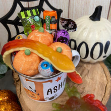 This gorgeous personalised 12oz Enamel Mug features a spooky Halloween design and is personalised with your chosen initial and name They are just perfect for filling with hot chocolate or spiced pumpkin latte on a crisp Autumn day. Each mug is made to order and is individually boxed to ensure it reaches you in perfect condition. These are suitable for hand washing only (but please do not leave submerged in water) and are not suitable for microwave use. You can choose to purchase just the mug on its own or filled with spooky Halloween treats. Each filled mug contains: 1 x Yellow Belly Snake 1 x Giant Spider 3 x Pumpkin Marshmallows 4 x Chocolate Eyeballs 3 x pieces of Halloween Mega Mix Please note that the contents may vary depending on availability but will always be just as yummy - please also note that the sweets are packed separately and do not come inside the mug Please email sales@persnicketyco.co.uk if you have any allergies or would like the ingredients list.