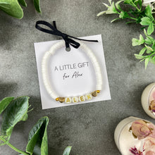 The bracelets are made from polymer clay disc beads with letter beads and finished with gold spacer beads and hearts. The bracelets are tied onto a backing card which features the text 'A LITTE GIFT for ....' and can be personalised with any name. They are then presented in a little organza bag.