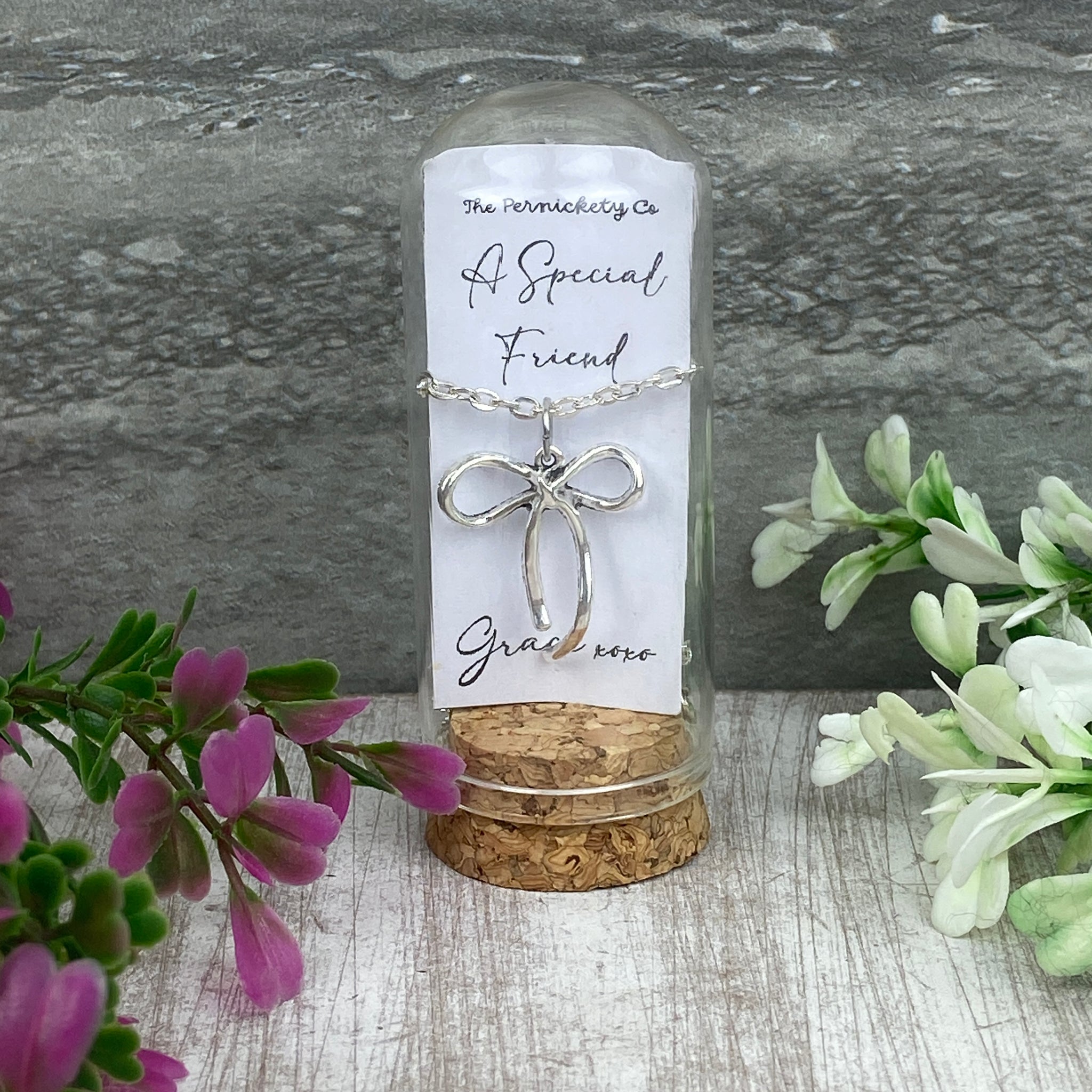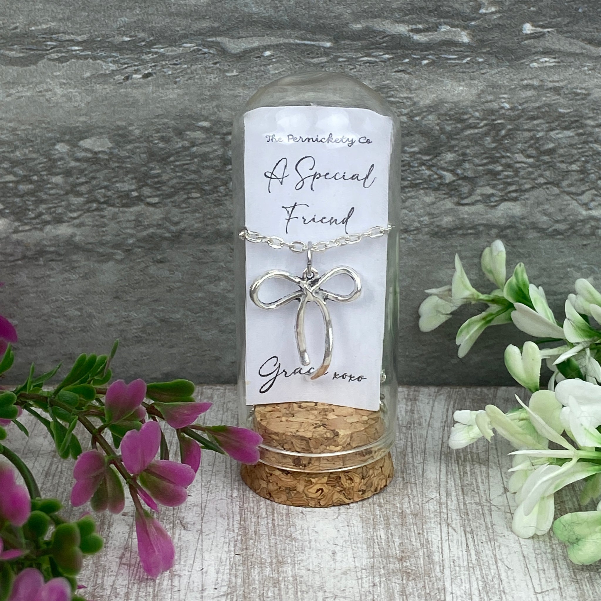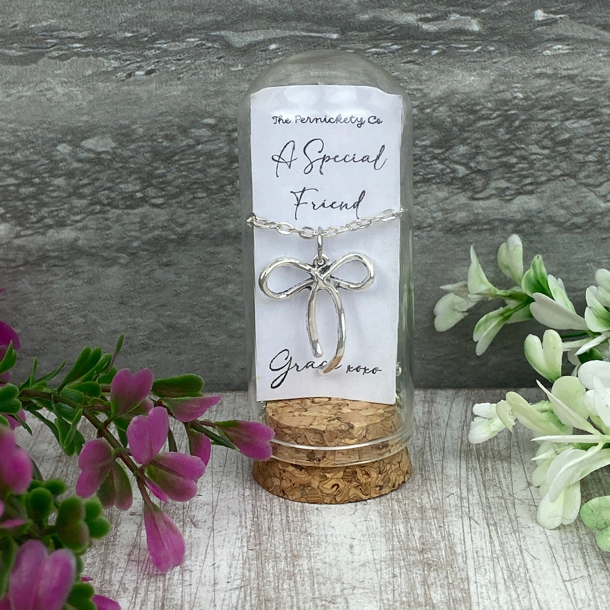Delight someone special with our Whimsical Bow Necklace, a dainty and feminine piece that captures the magic of thoughtful giving. Presented beautifully in a glass cloche with a cork base, this charming necklace makes a heartfelt keepsake for birthdays, thank-you gifts, or “just because” moments.
