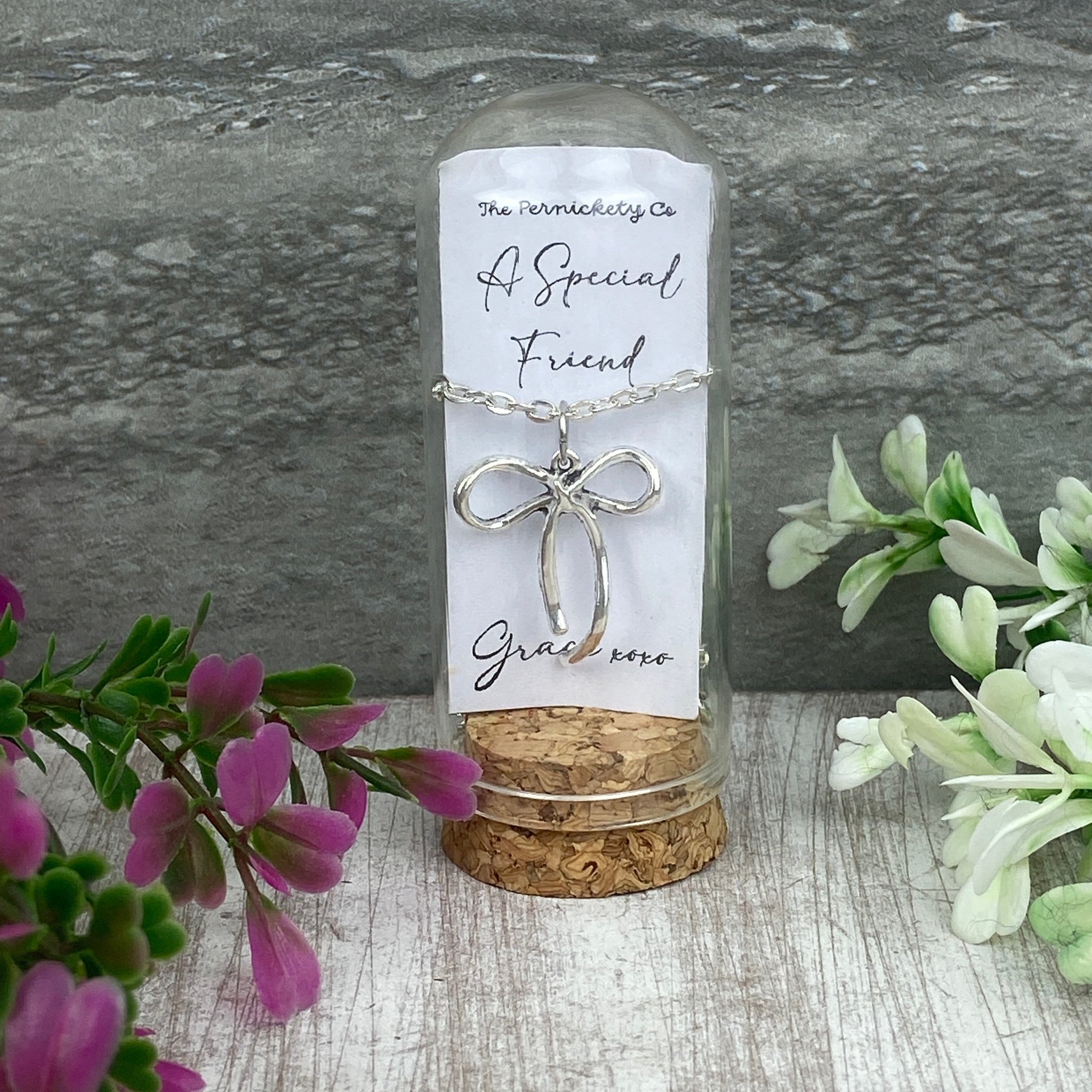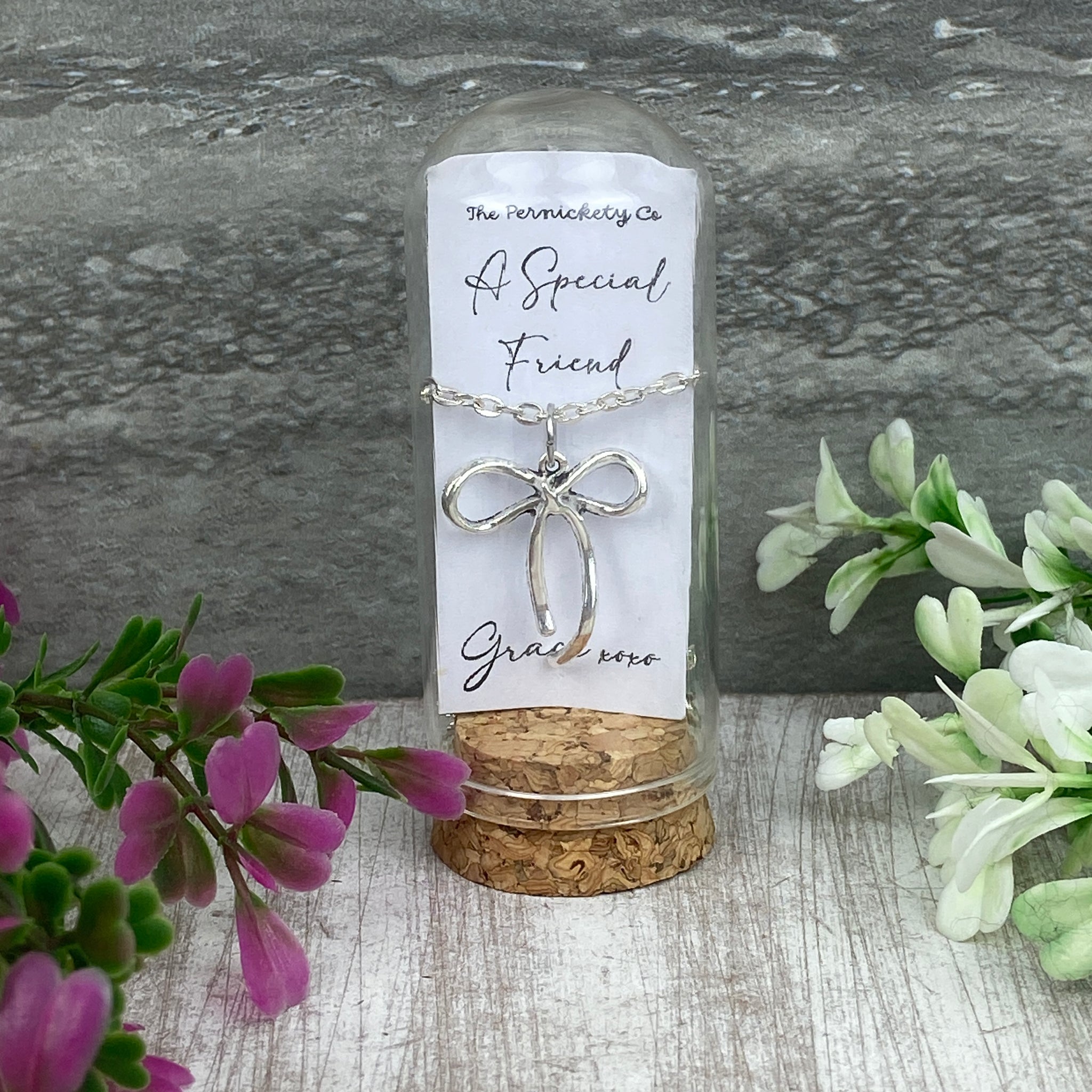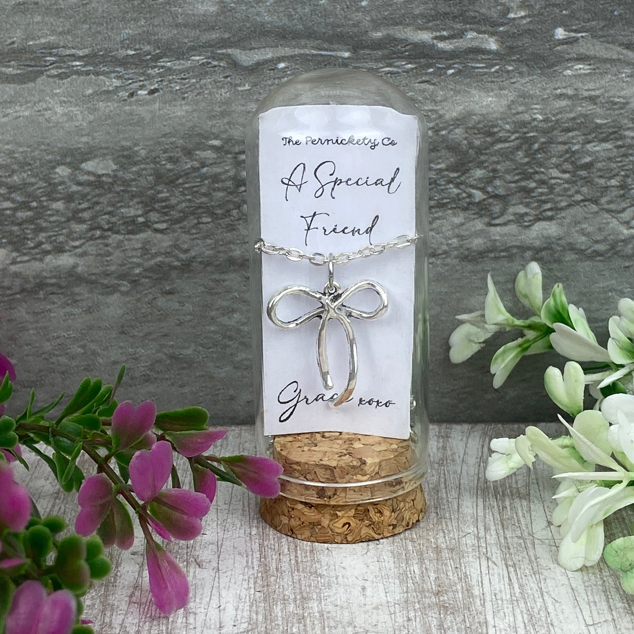 Delight someone special with our Whimsical Bow Necklace, a dainty and feminine piece that captures the magic of thoughtful giving. Presented beautifully in a glass cloche with a cork base, this charming necklace makes a heartfelt keepsake for birthdays, thank-you gifts, or “just because” moments.
