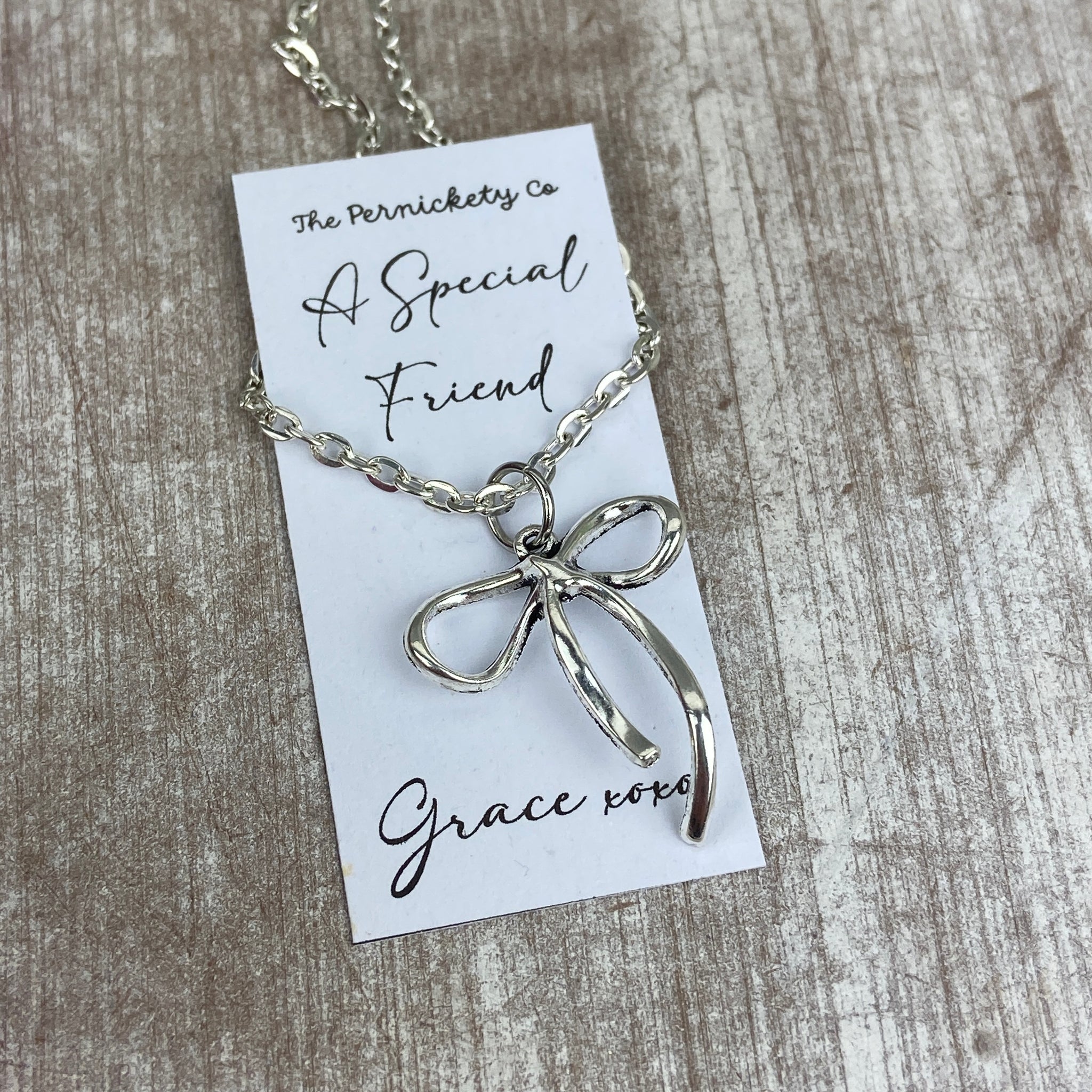 Each necklace features a delicate silver bow charm, symbolising love, friendship, and the little ties that bind us together.