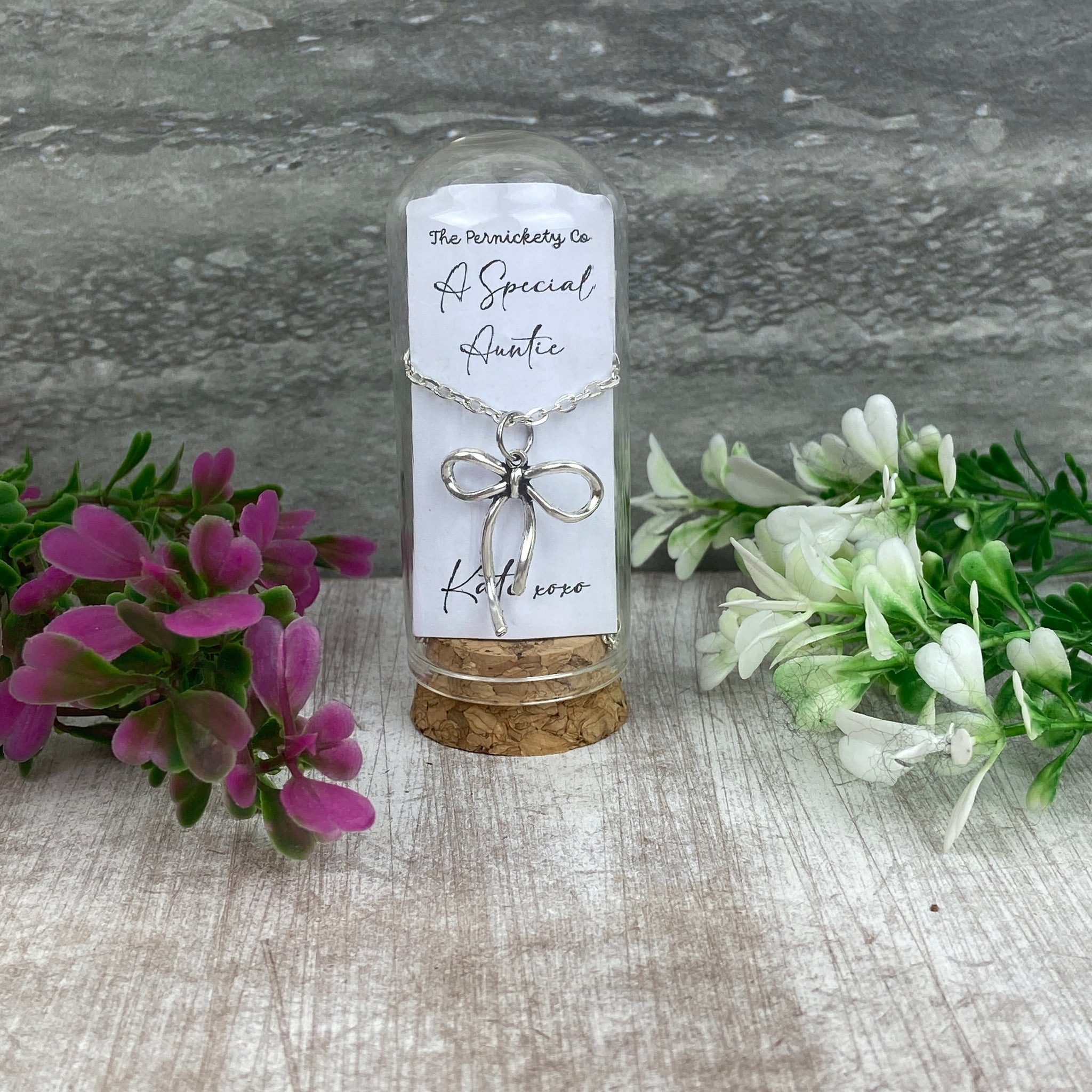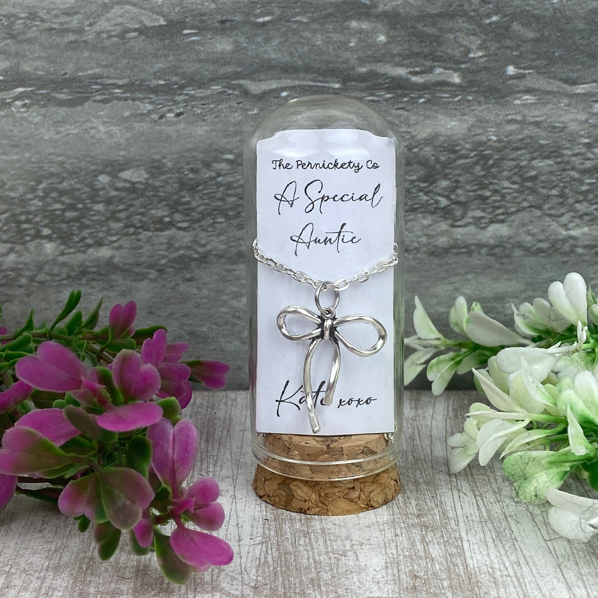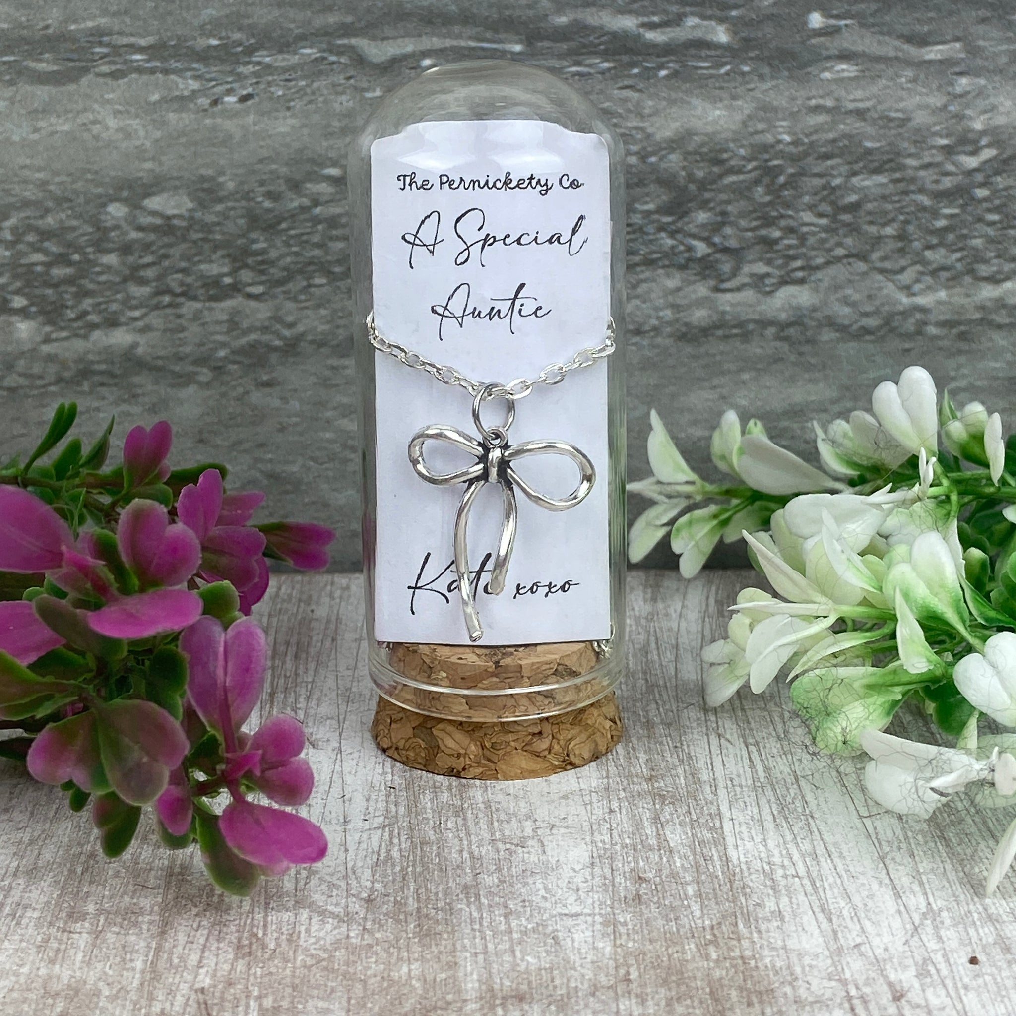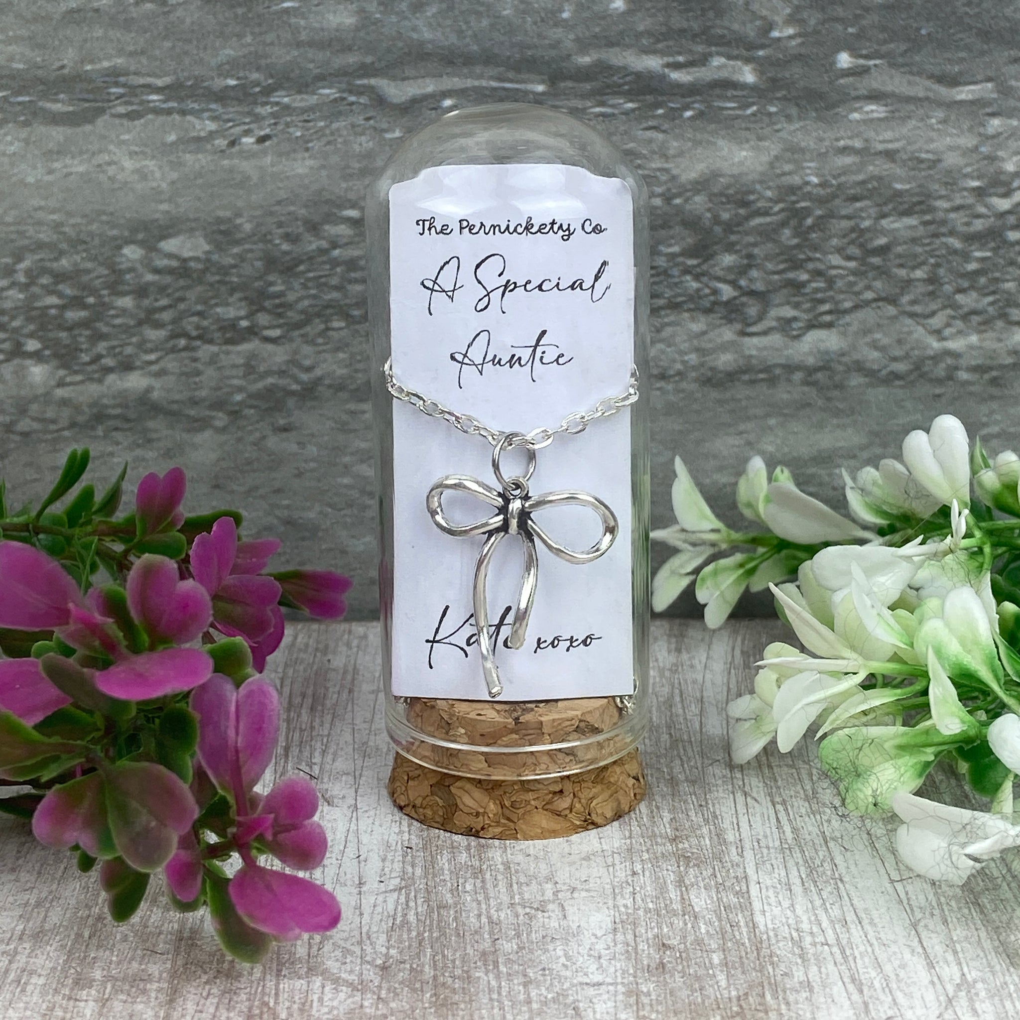 Show your auntie just how much she means to you with our Whimsical Bow Necklace, a beautifully delicate piece presented in a glass cloche with a cork base — ready to gift straight away.