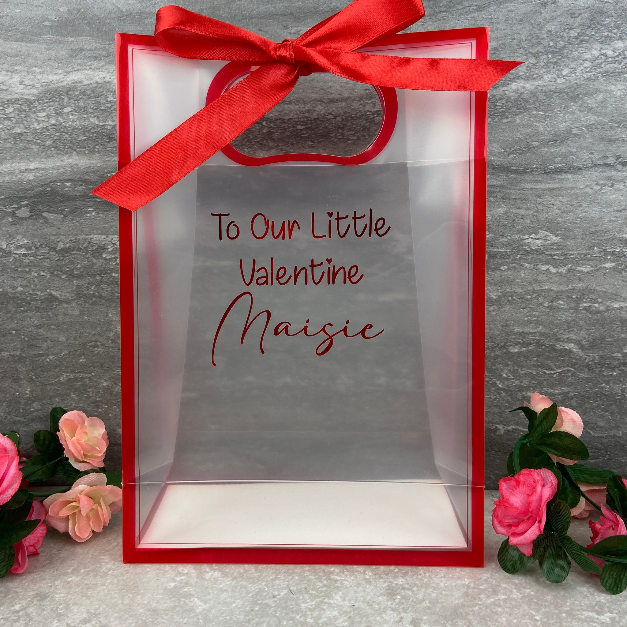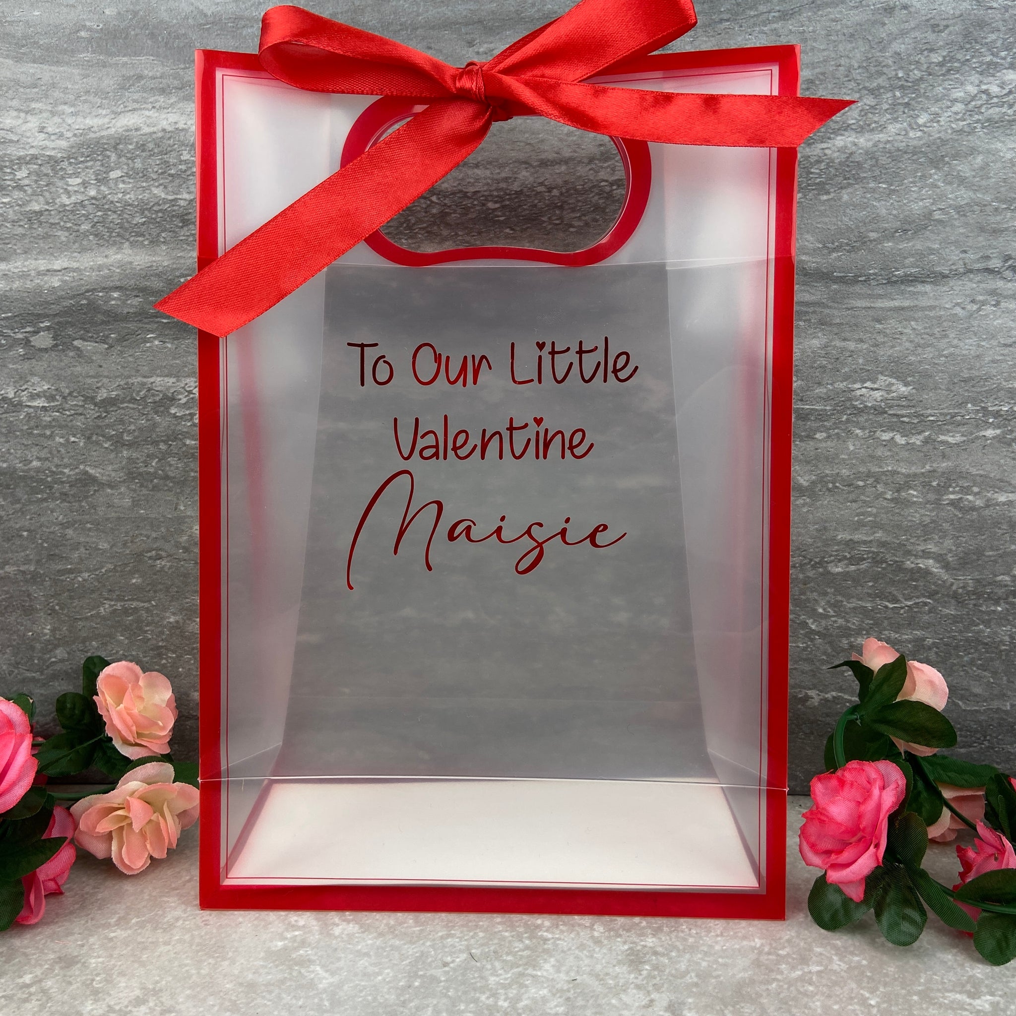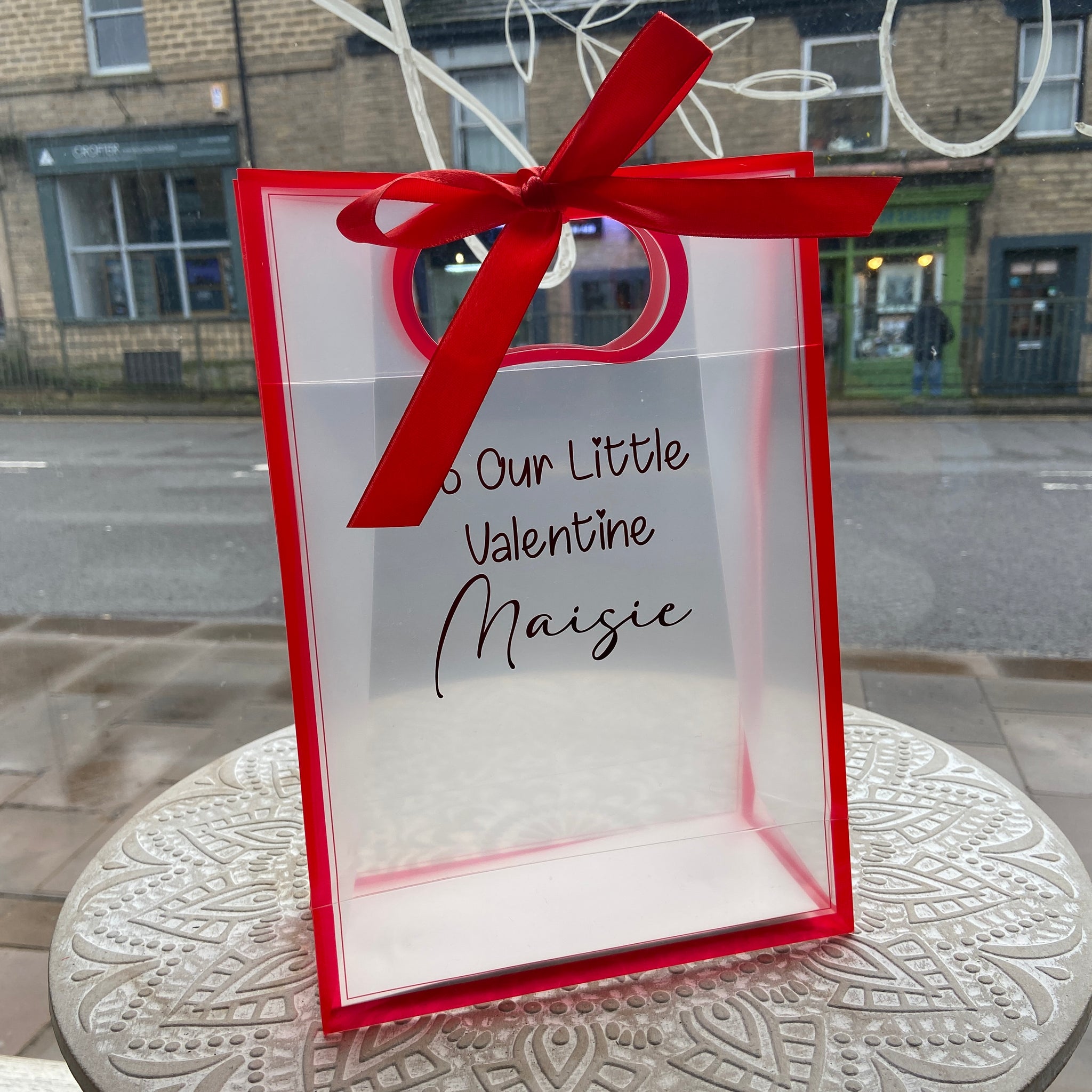 Crafted from a clear PVC material with a bold red border and finished with a matching red ribbon, this charming bag is personalised with your chosen name and message – perfect for little valentines, children, or anyone who deserves a thoughtful keepsake.