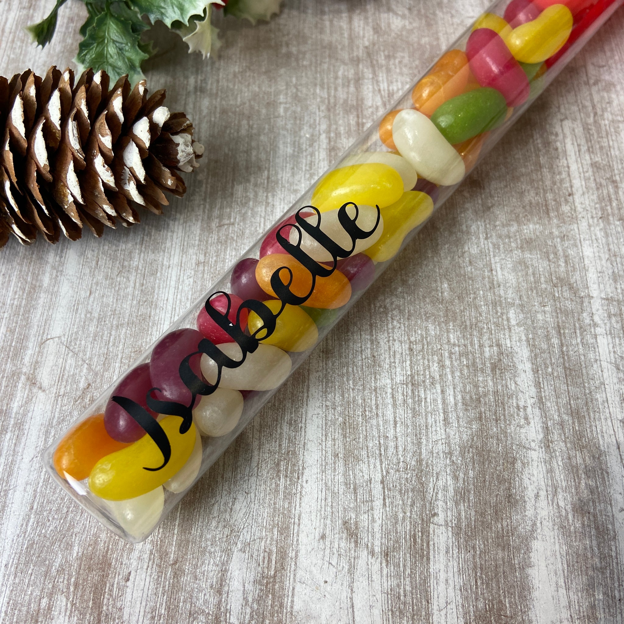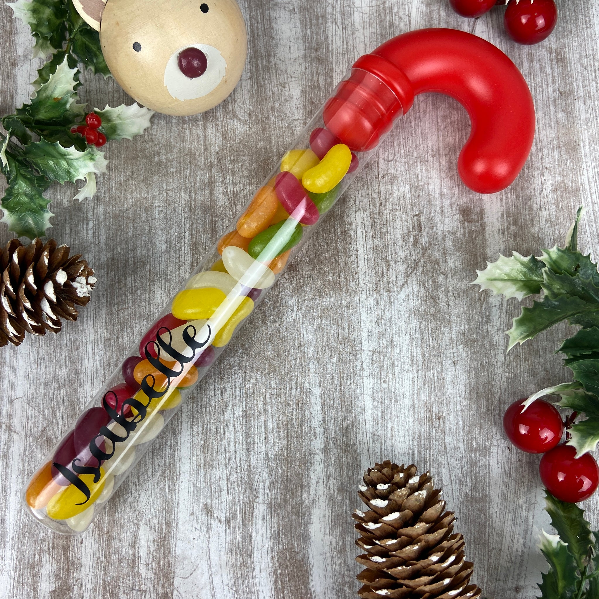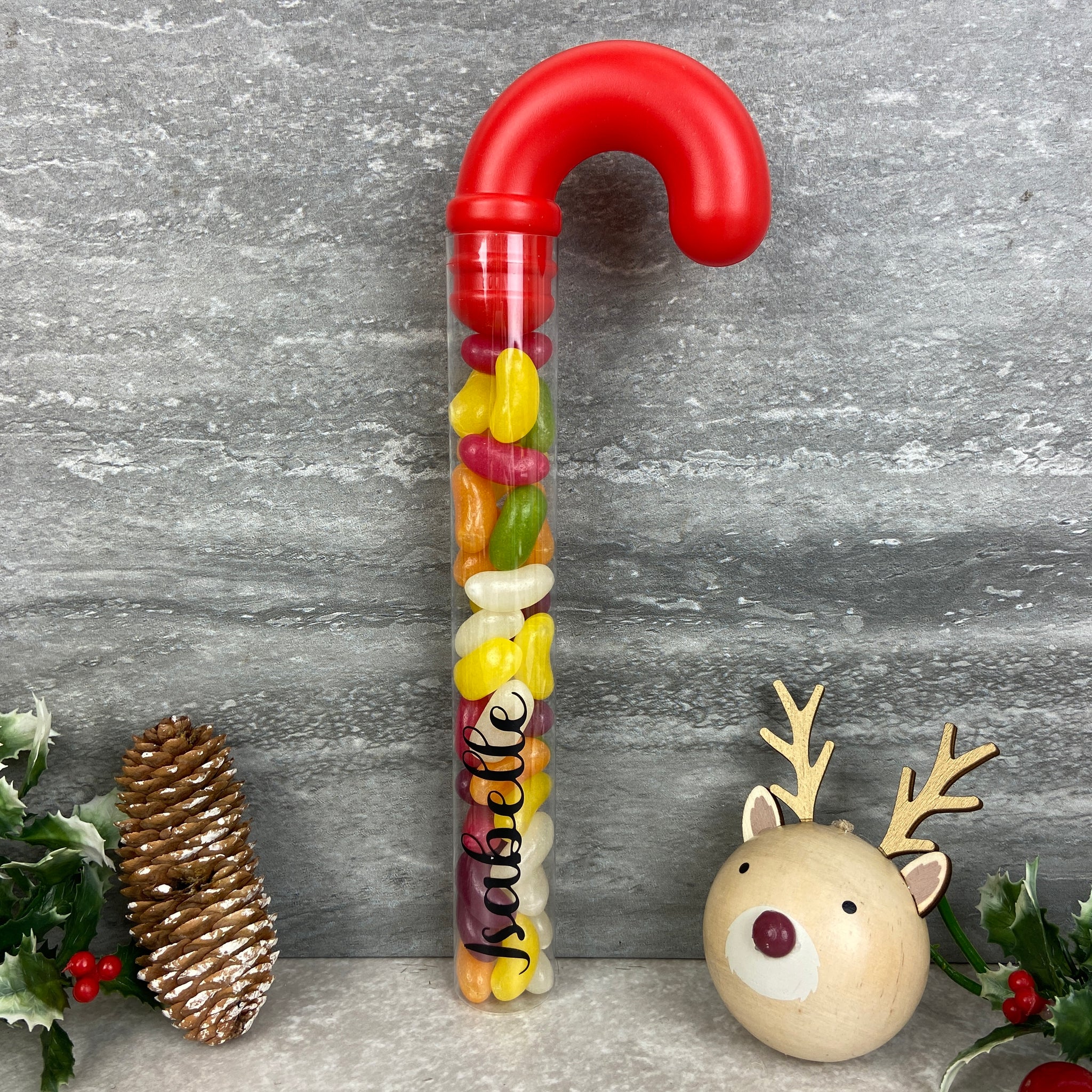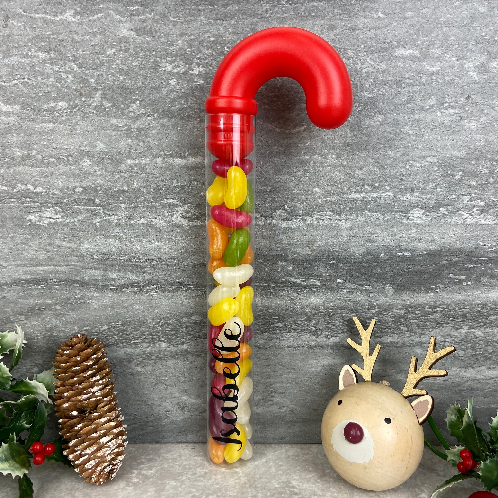 Each candy cane tube is customised with any name in sleek black vinyl, making it a lovely little gift for children, friends, or anyone with a sweet tooth. With its cheerful red hook top and vibrant jelly beans inside, itβs the perfect addition to Christmas Eve boxes, stockings, party bags, or festive table settings.