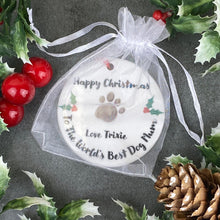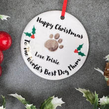 If you are looking for a sweet personalised Christmas decoration for the worlds best dog mum or dad then this beautiful personalised hanging ceramic decoration with ribbon is the perfect Christmas keepsake gift.